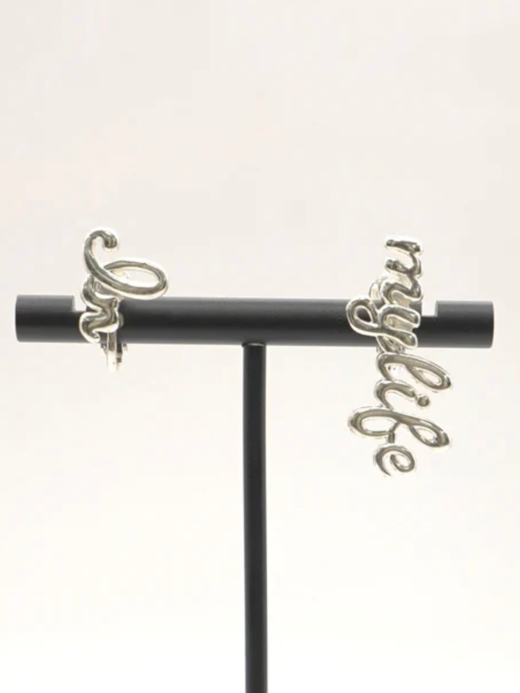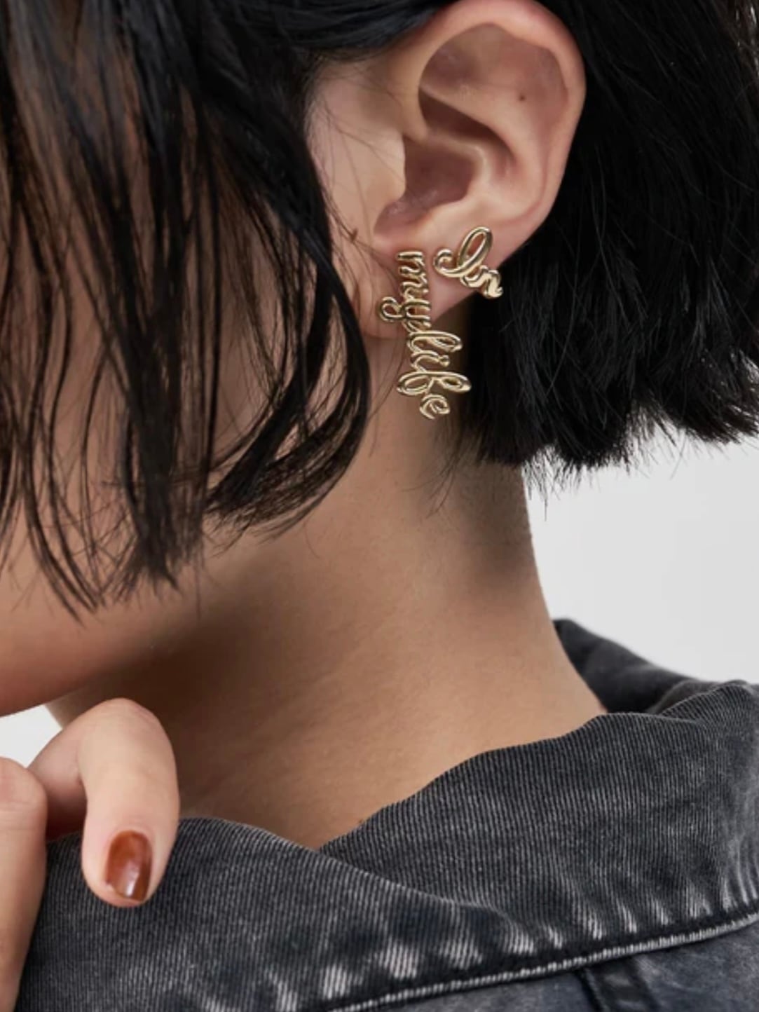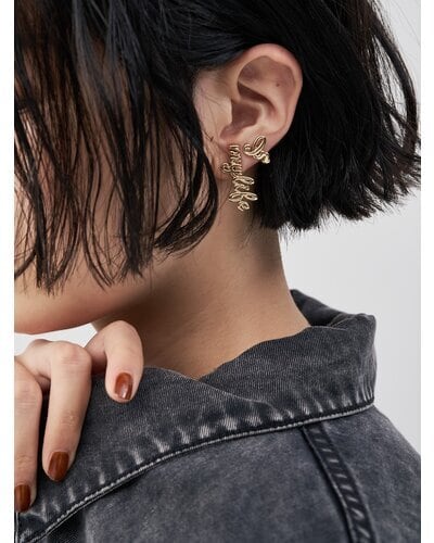 「In」「MyLife」のロゴモチーフの組み合わせが目を引くアシメイヤリングは、ぷっくりとした筆記体で女性らしく仕上げました。