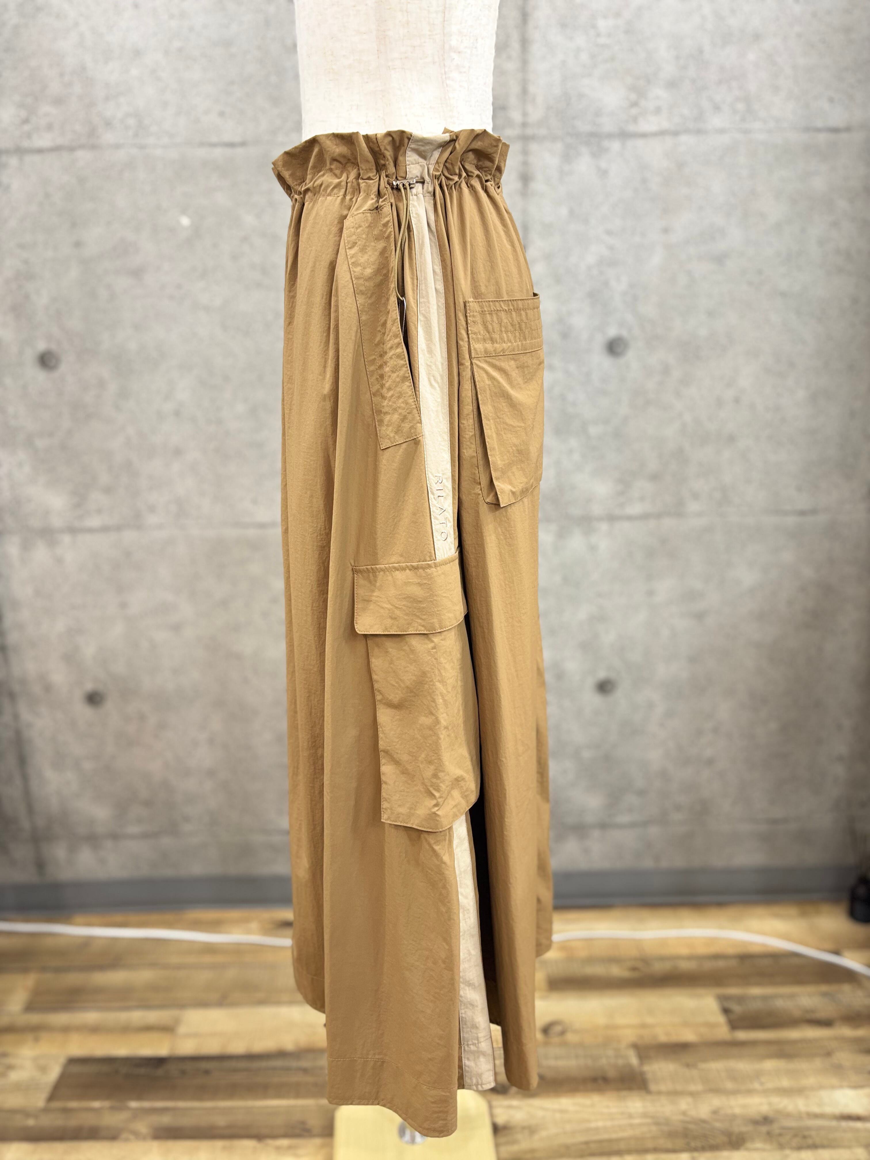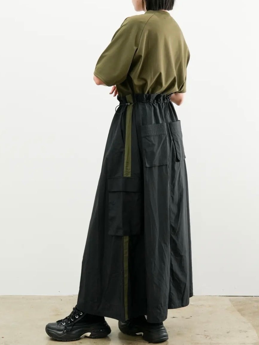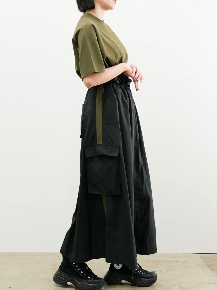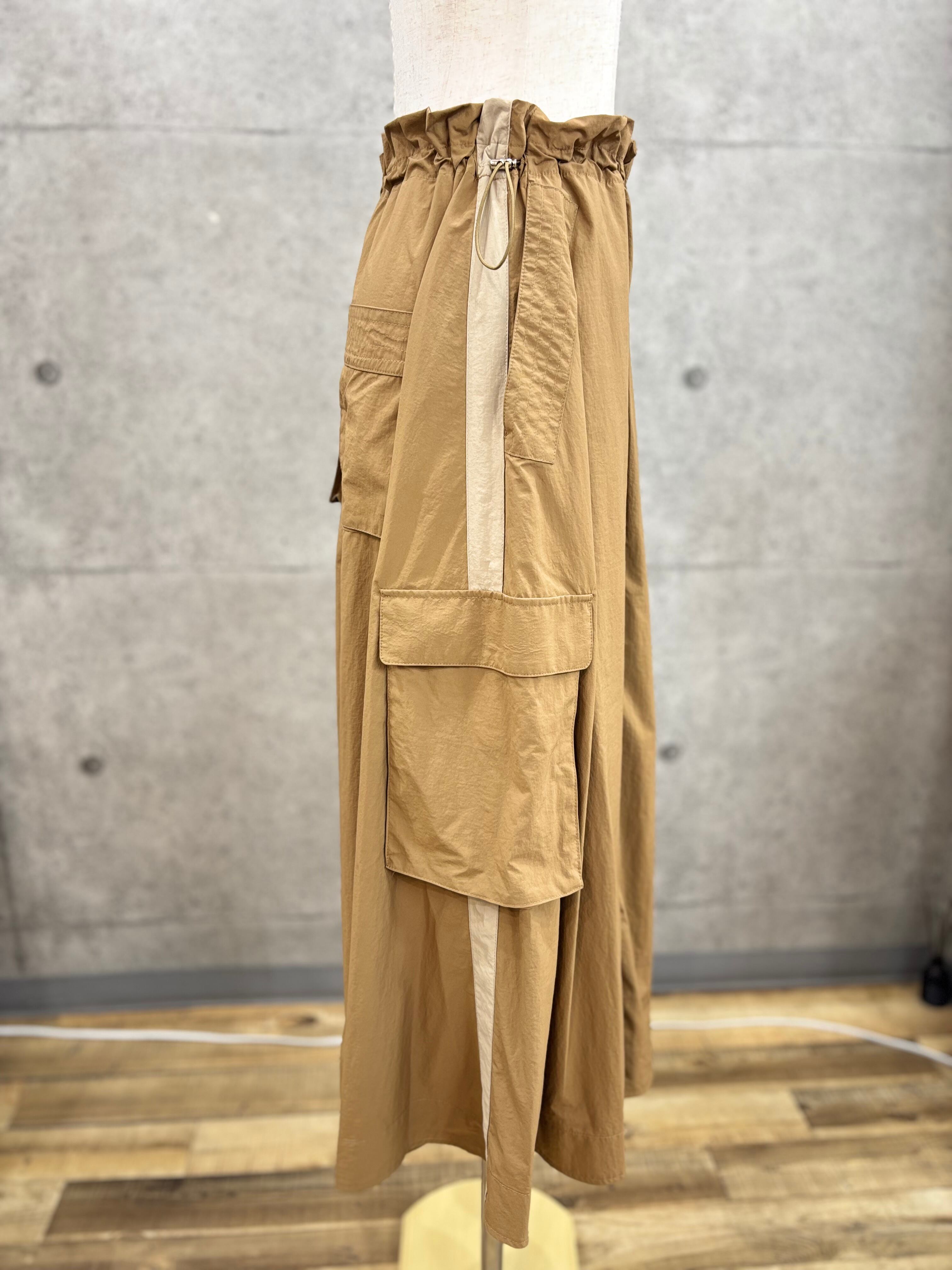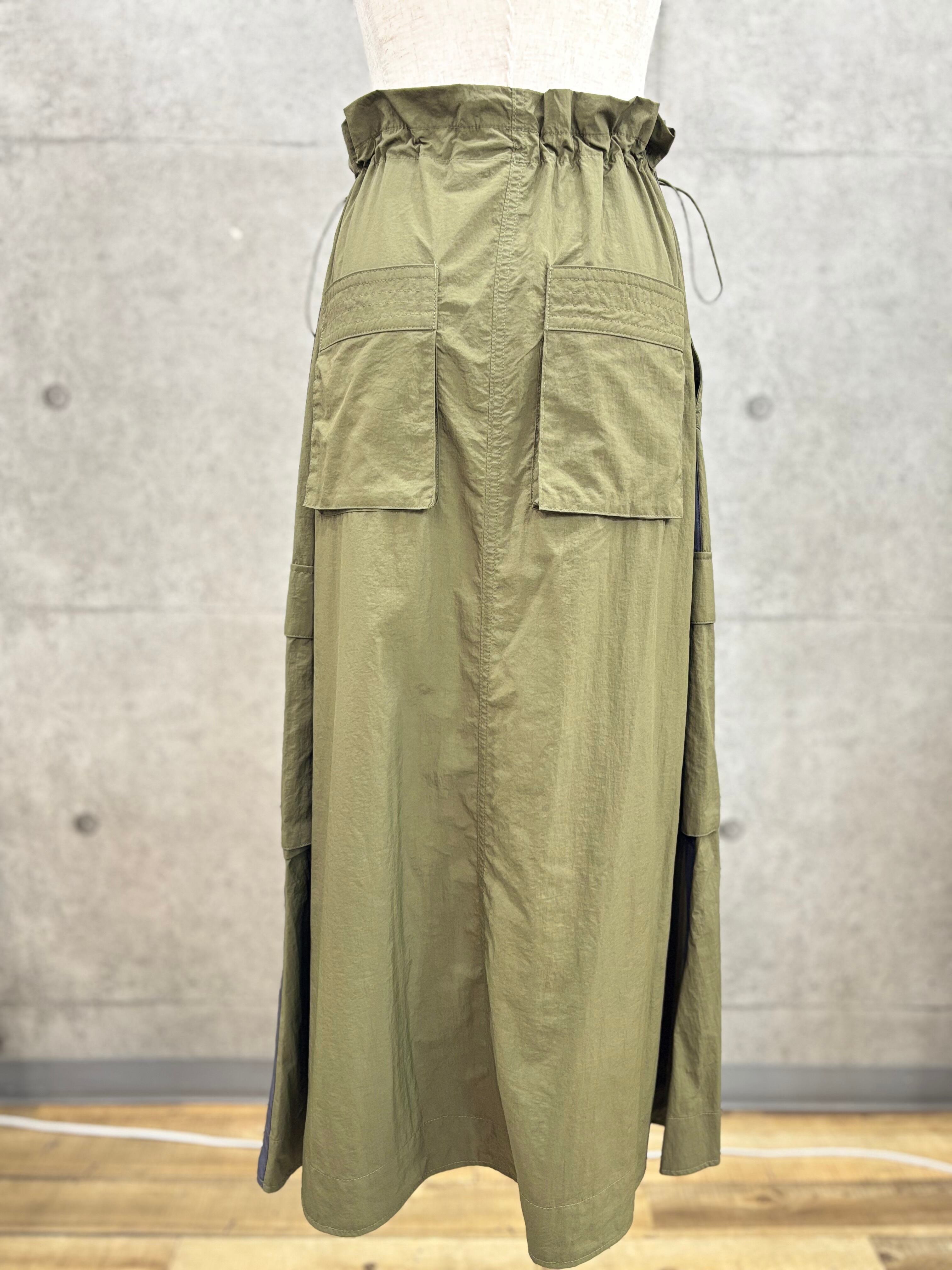 甘さを抑えたナイロン素材で、ミリタリーテイストを程よく効かせた大人のカーゴスカートです