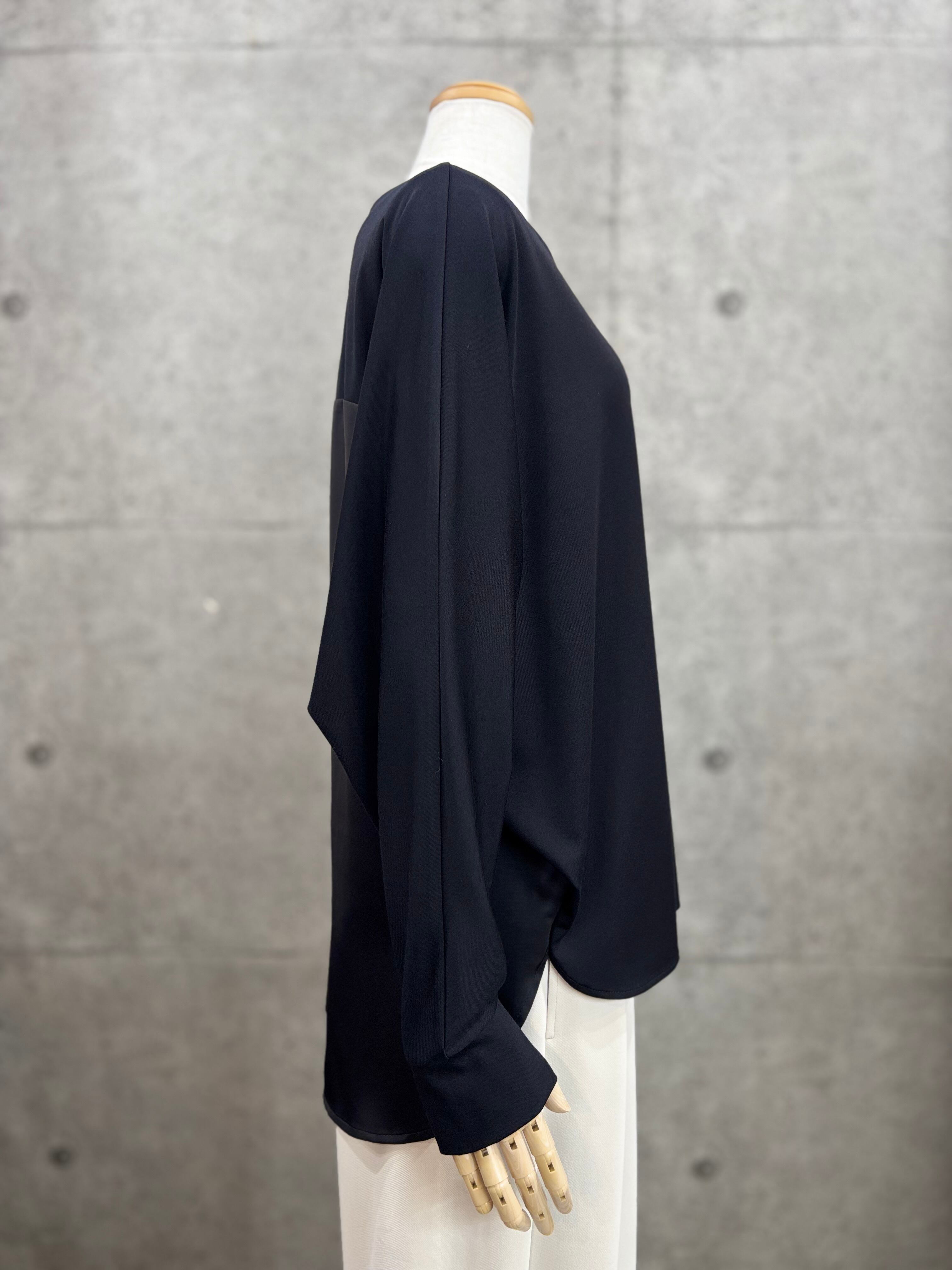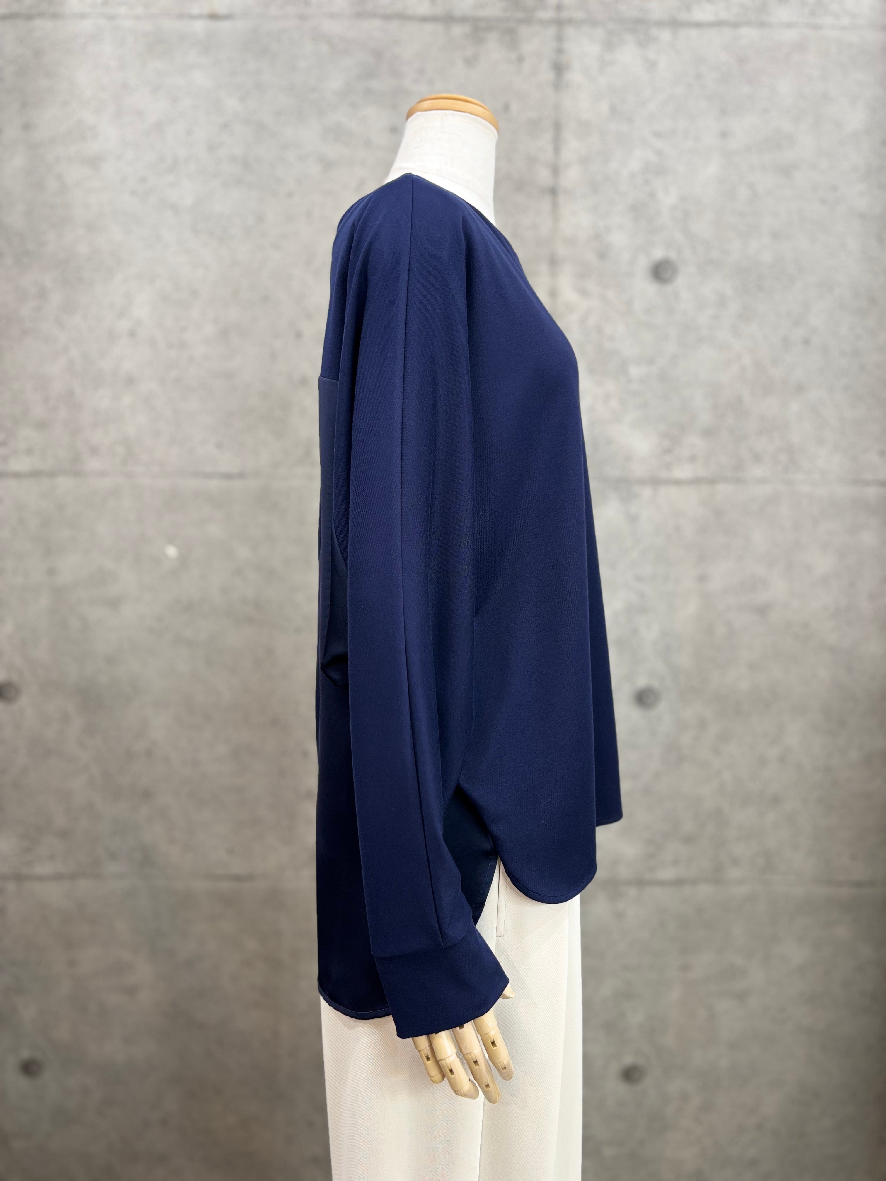 厚すぎず薄すぎずストレッチが程良く効いたちょうど良い生地感がメインのプルオーバに布帛生地を後身頃に切り替えでついているので、キチンと感もあり、ON/OFF問わずご着用頂けます