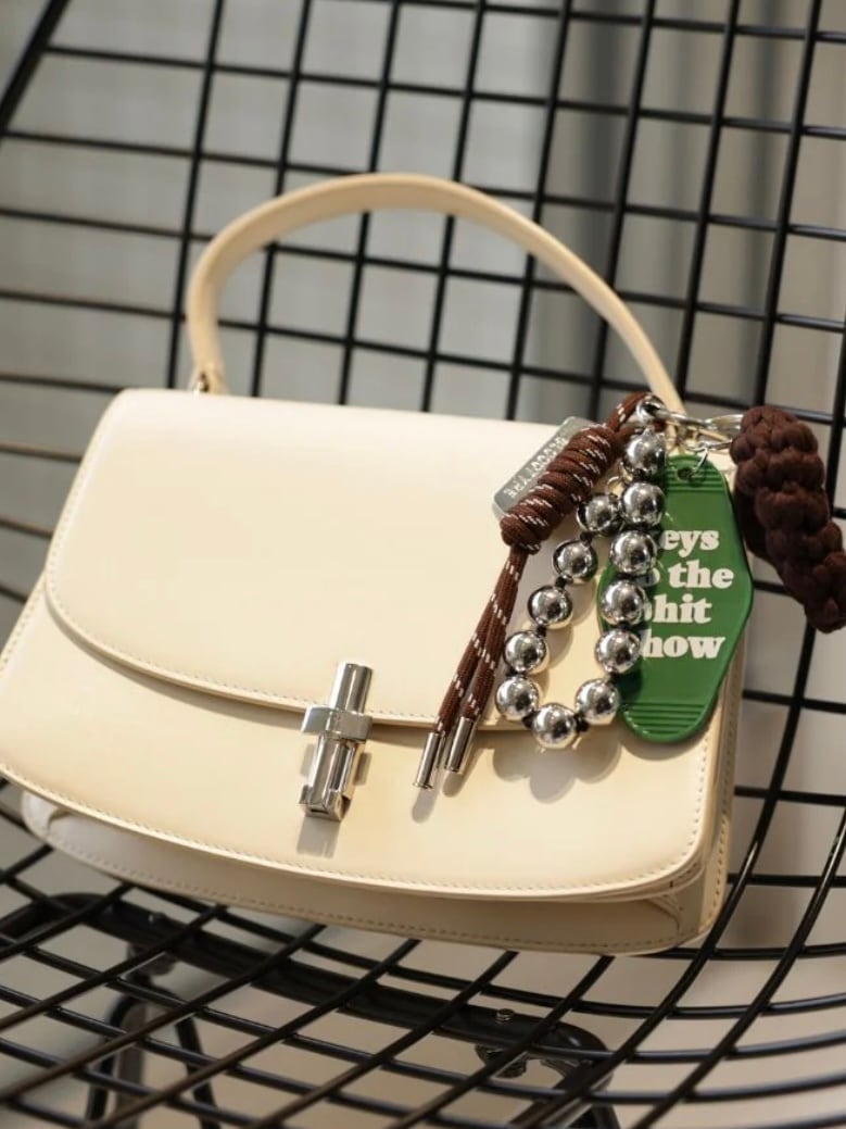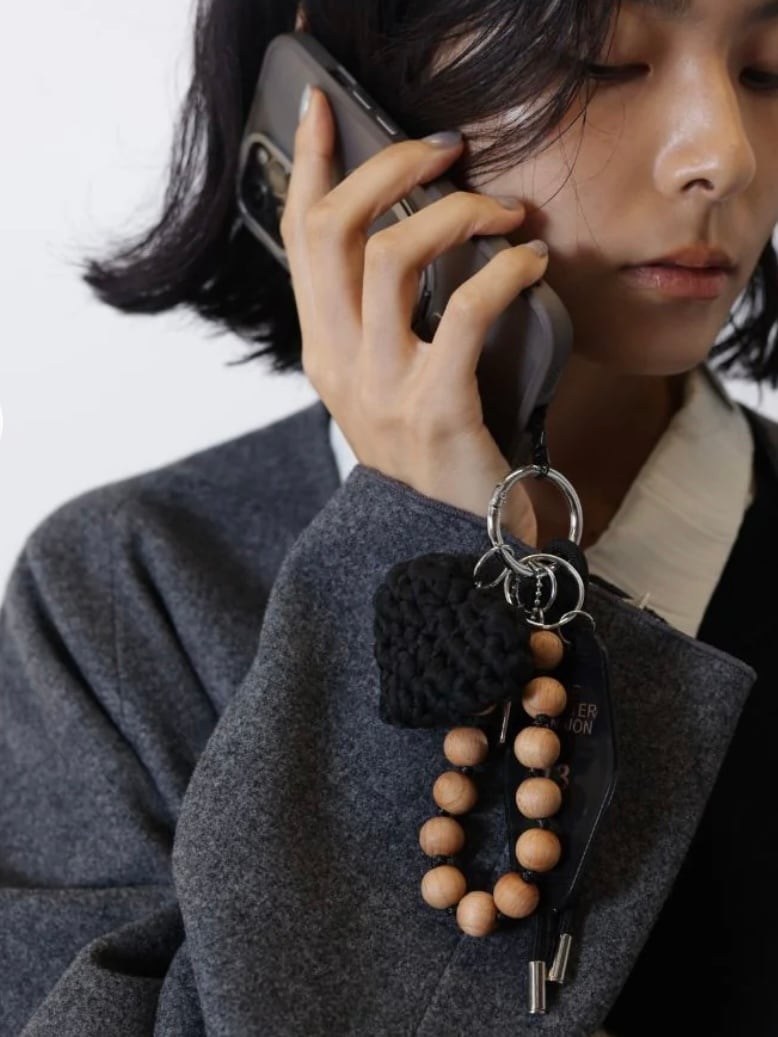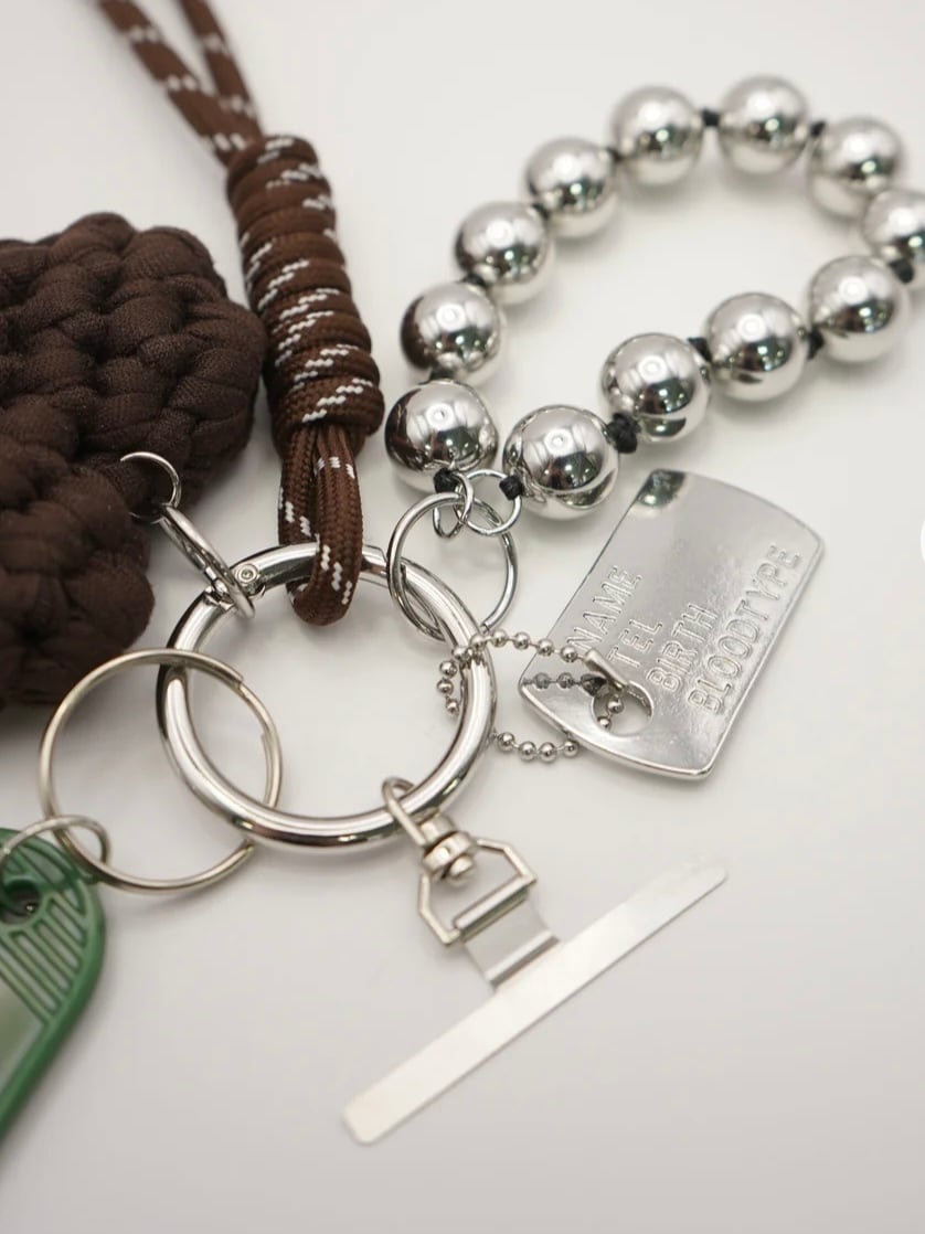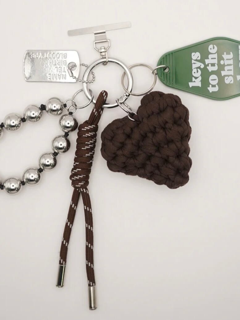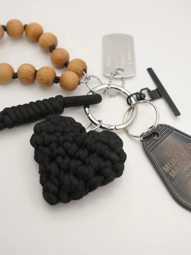 存在感のある太めコード、手編みハート、ドッグタグ、モーテルキー風キーホルダー、それぞれのパーツはすべて取り外し可能なので、その日の気分やシーンに合わせてカスタムして自由にアレンジができます。