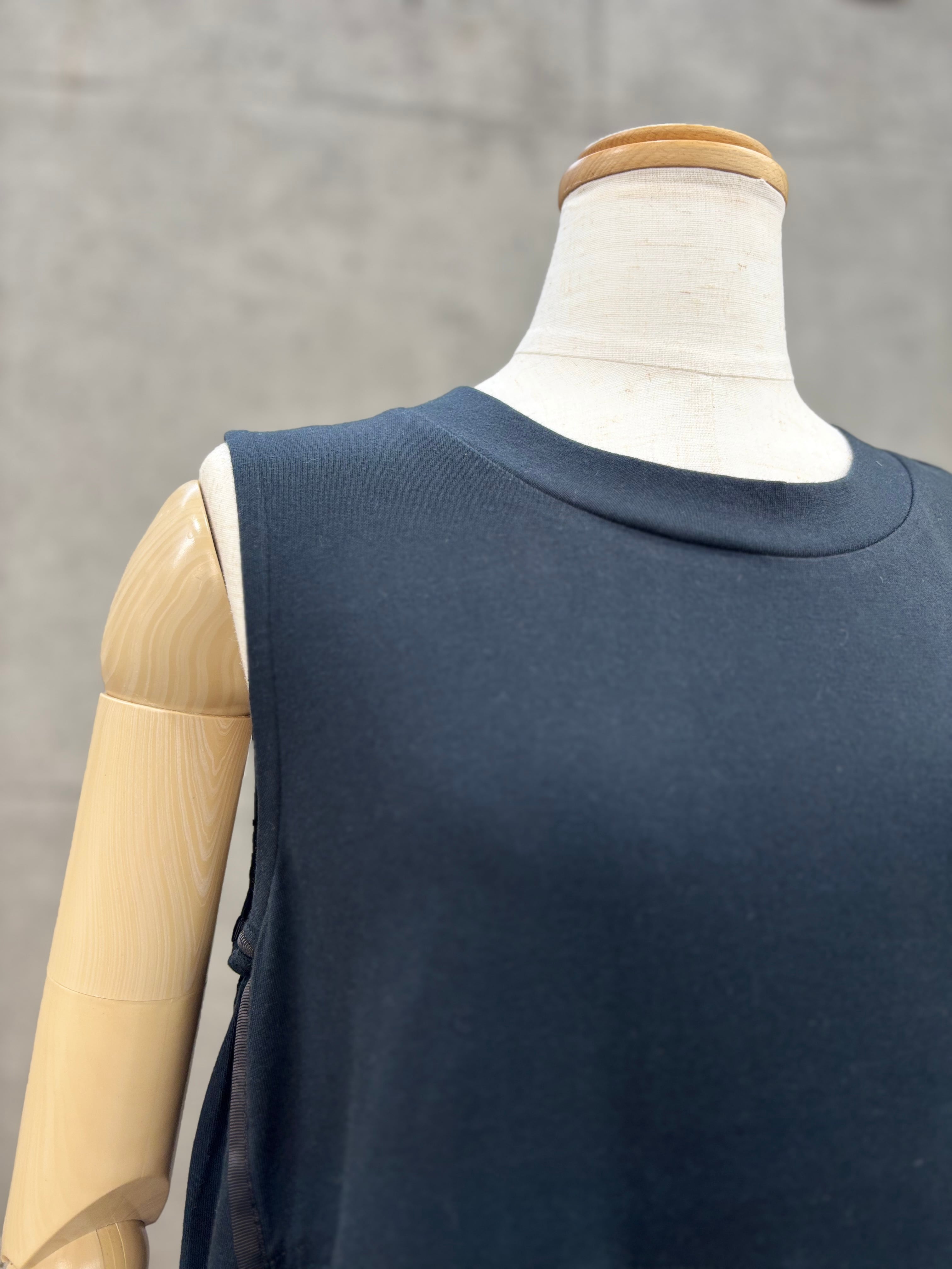 ワンピースはロング丈で布帛とカットソーを異素材切り替えで動くと光の加減で奥行きがでます