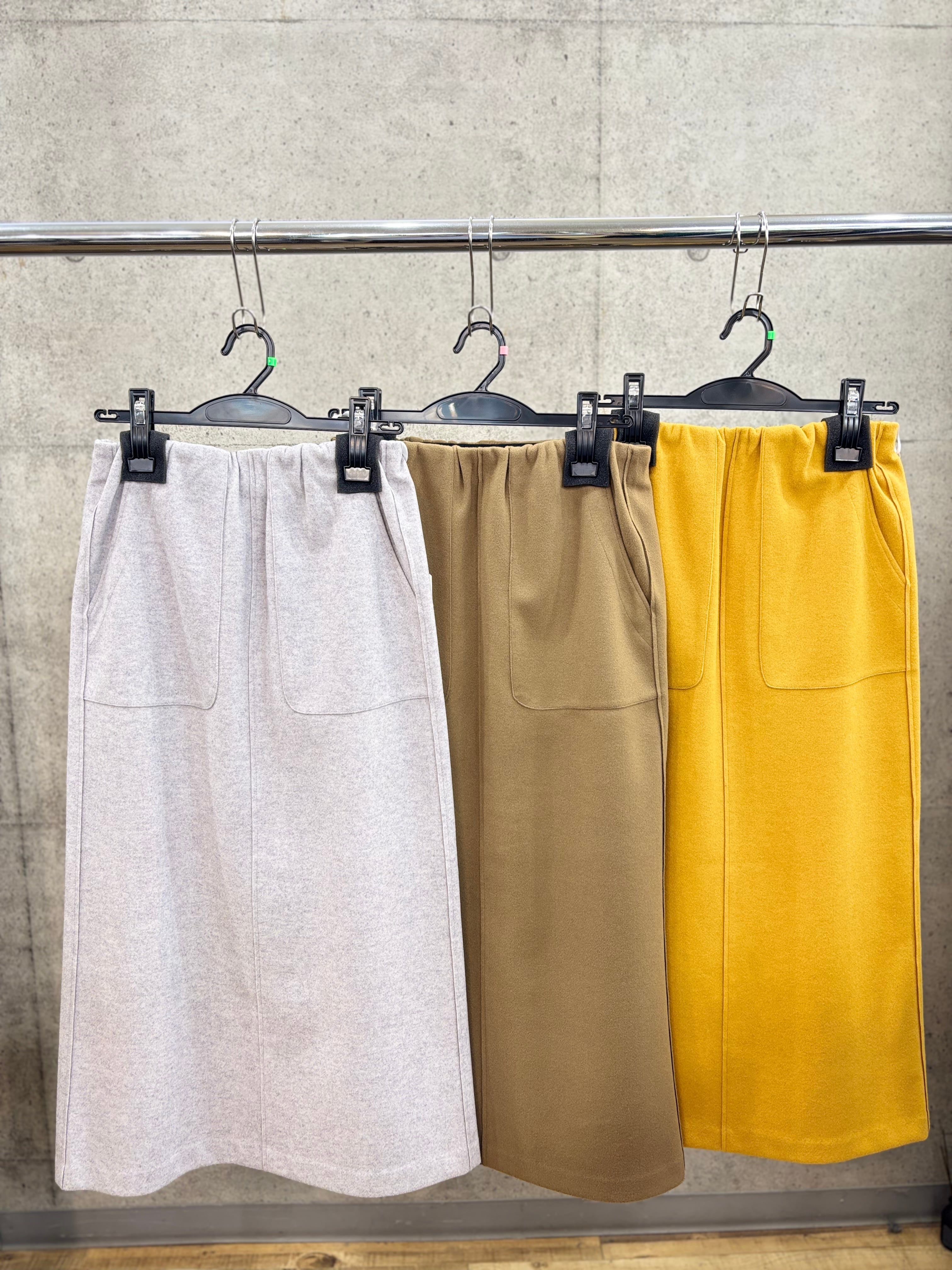 程良い厚みと柔らかな風合いがみりょくのウールライクなポリエステル生地を使用したタイトスカート