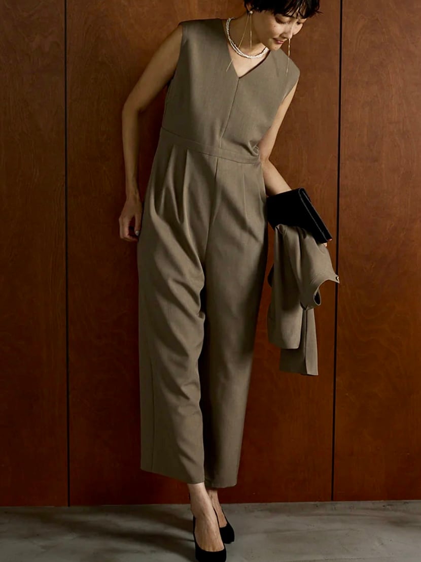 コンビネゾンは少しウエストの切り替えを上側に設定し、ショート丈のジャケットと合わせることでスタイルアップ効果を持たせました。