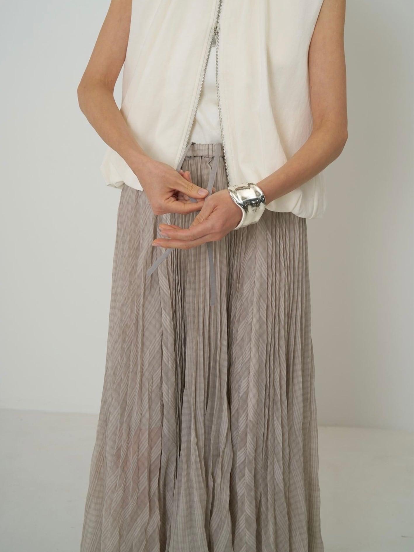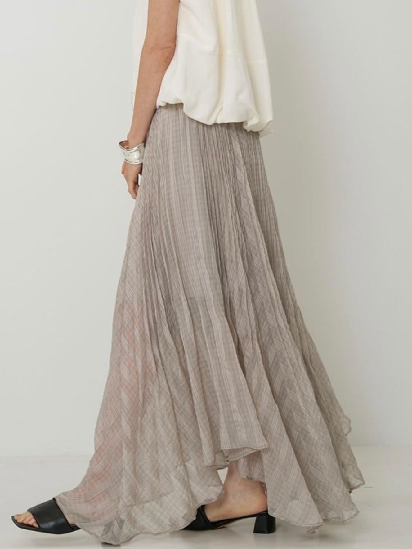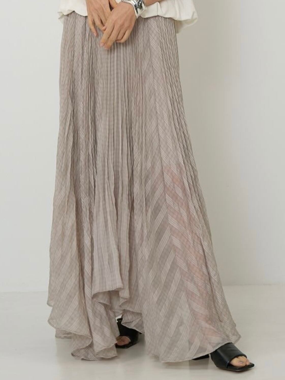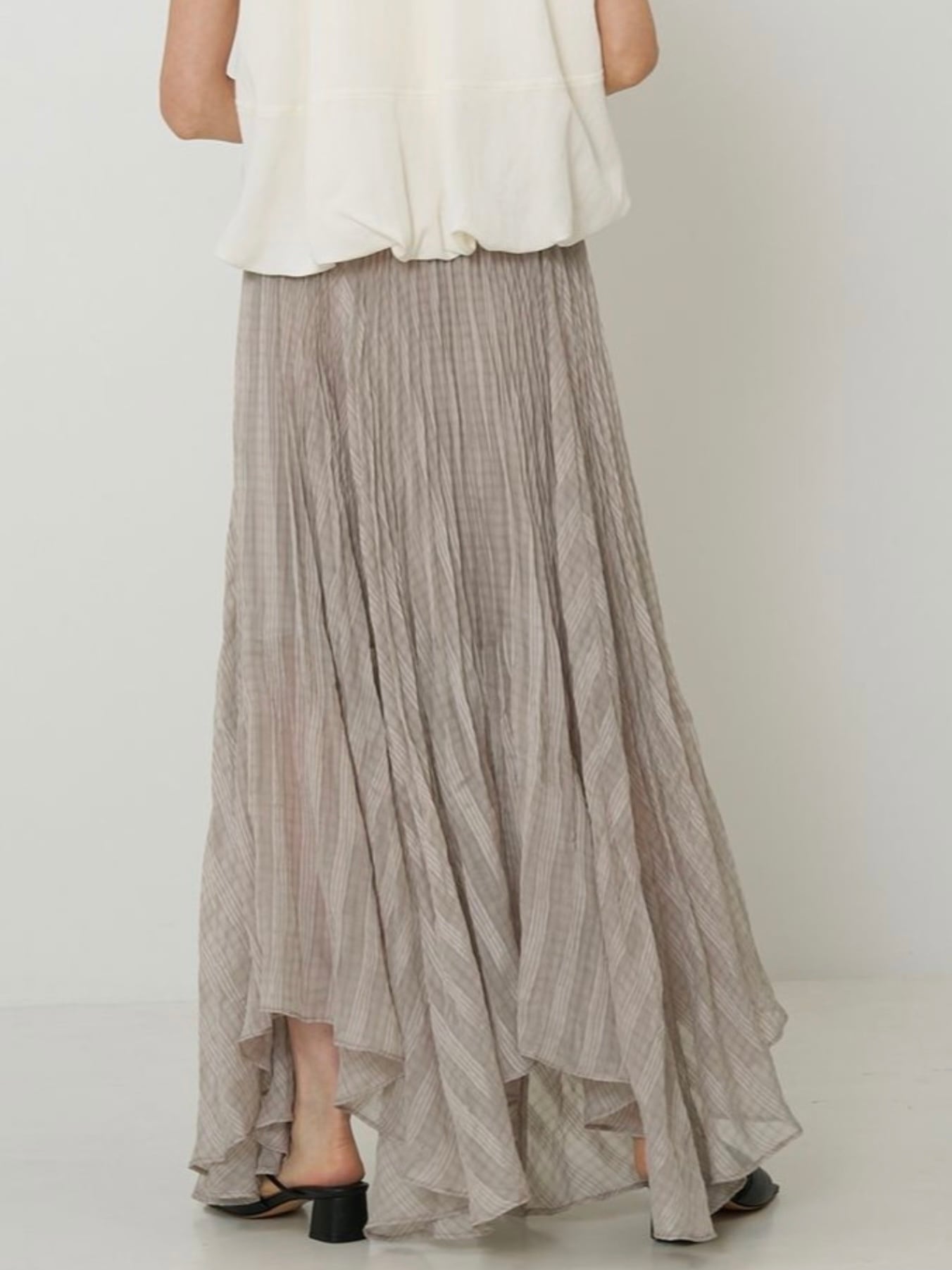 ウエストから入った繊細なプリーツは、裾に向かって自然に消えていくデザインで歩くたびにふわりと広がるシルエットが、シアー素材の魅力を引き立てます。