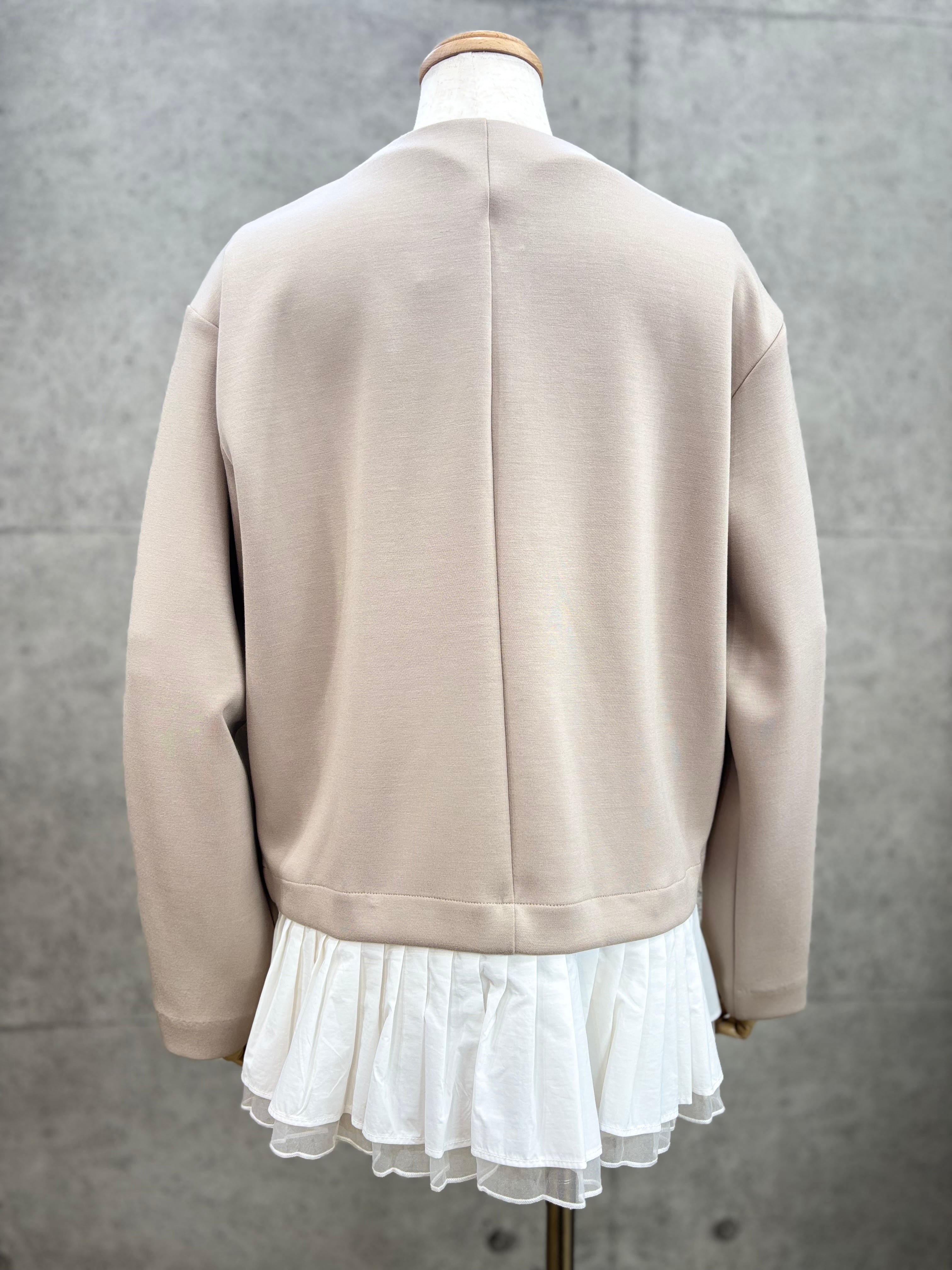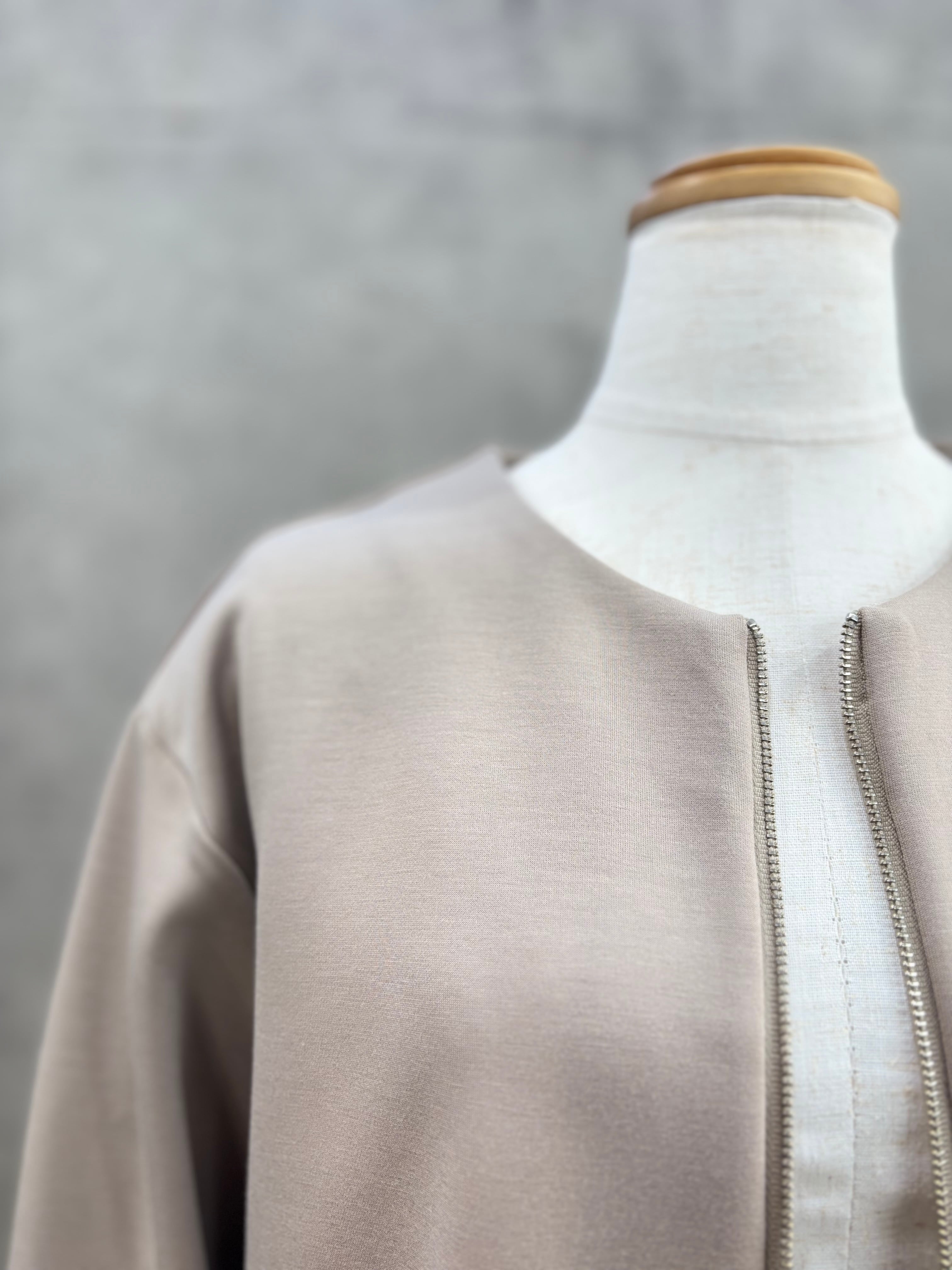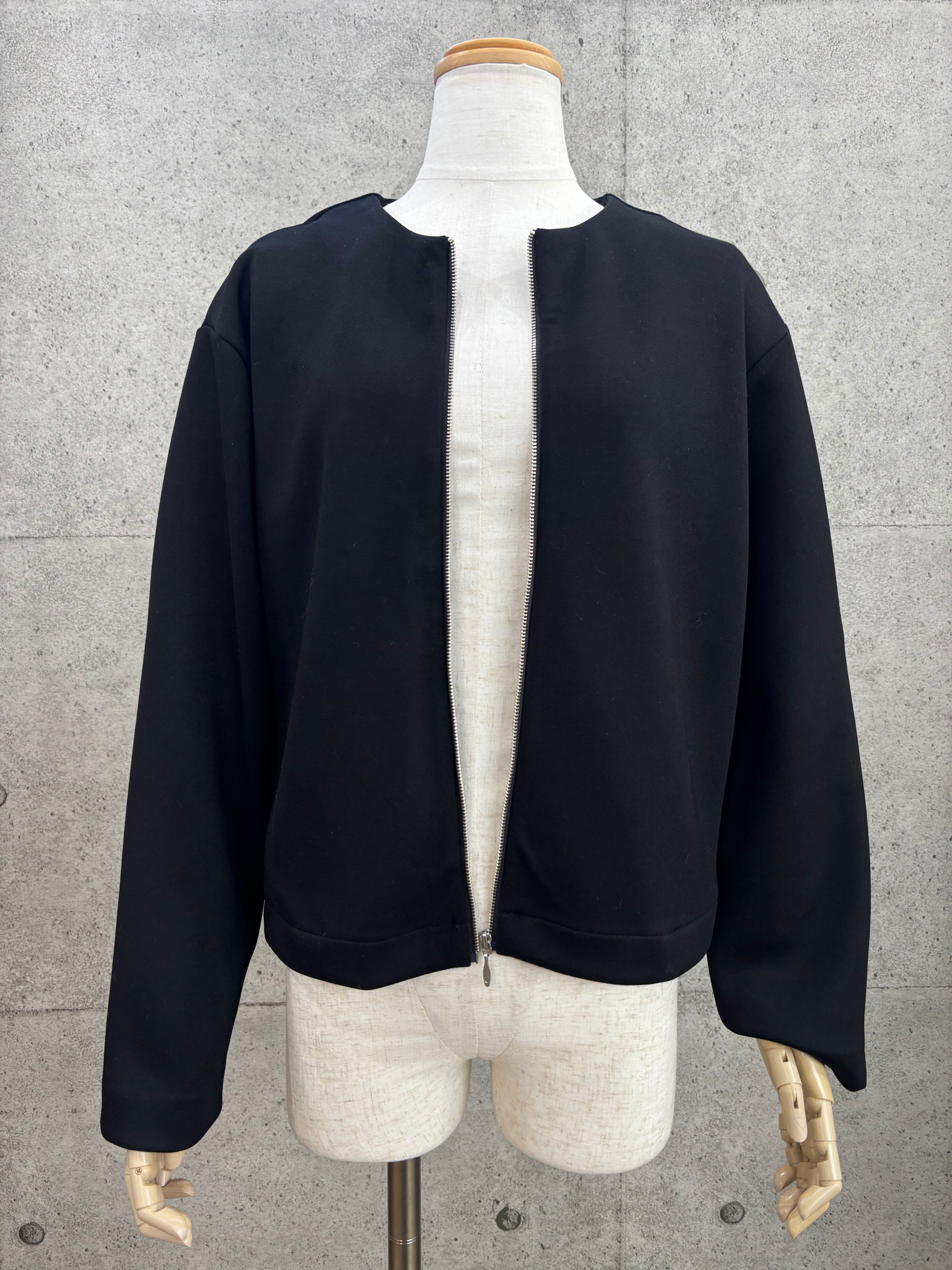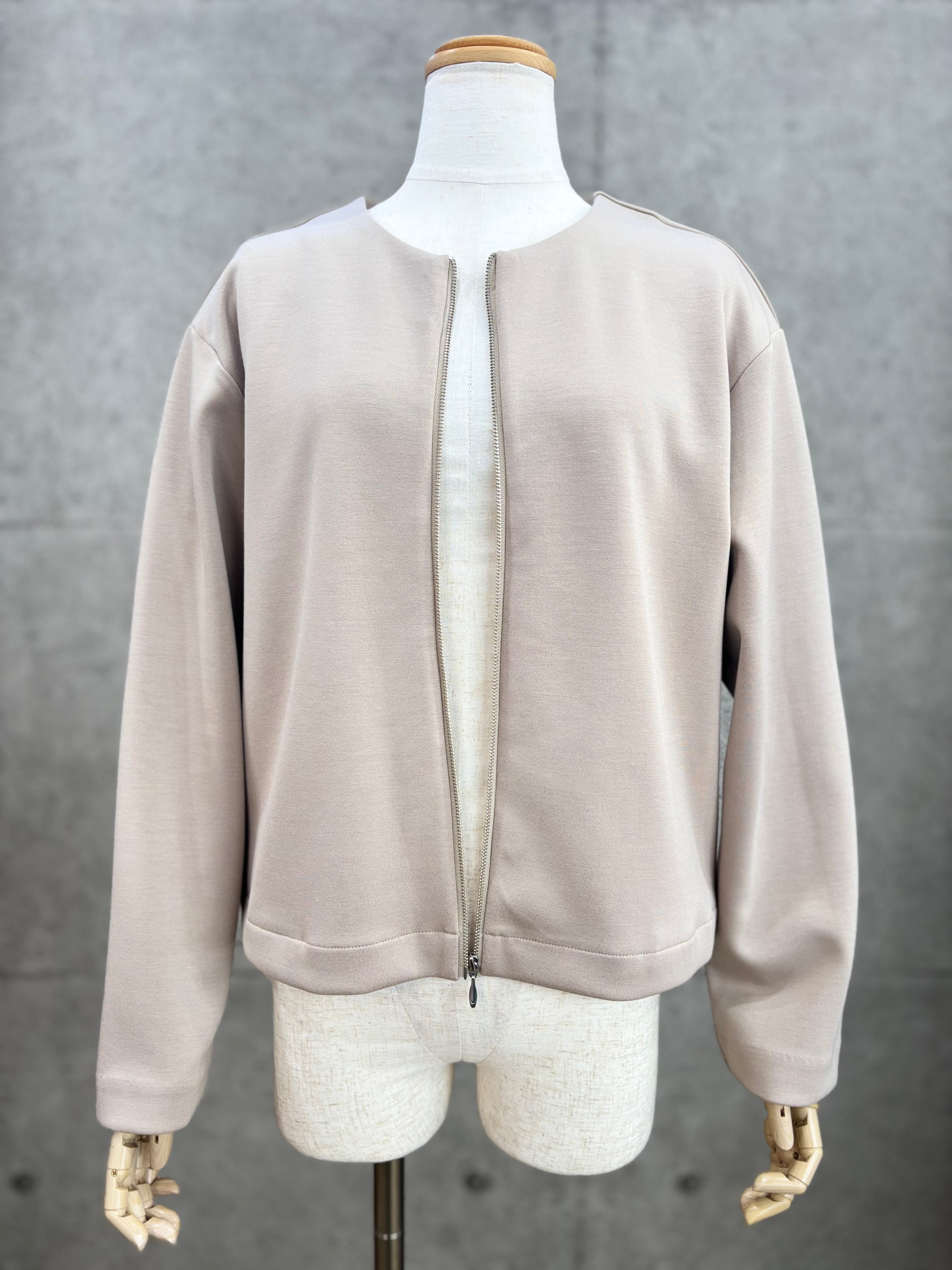 シンプルなノーカラーブルゾンの裾に異素材がアクセントになった大人の1枚