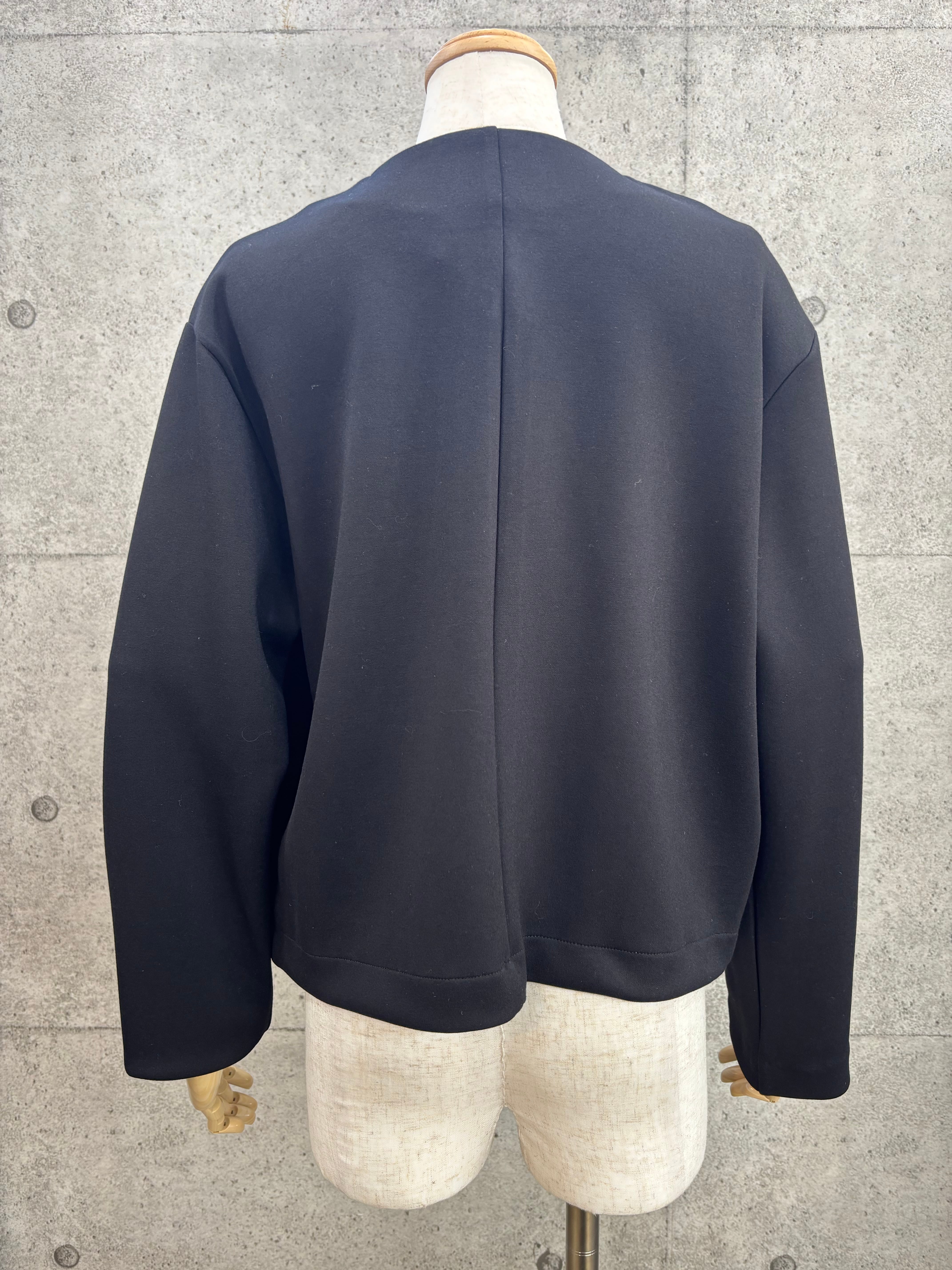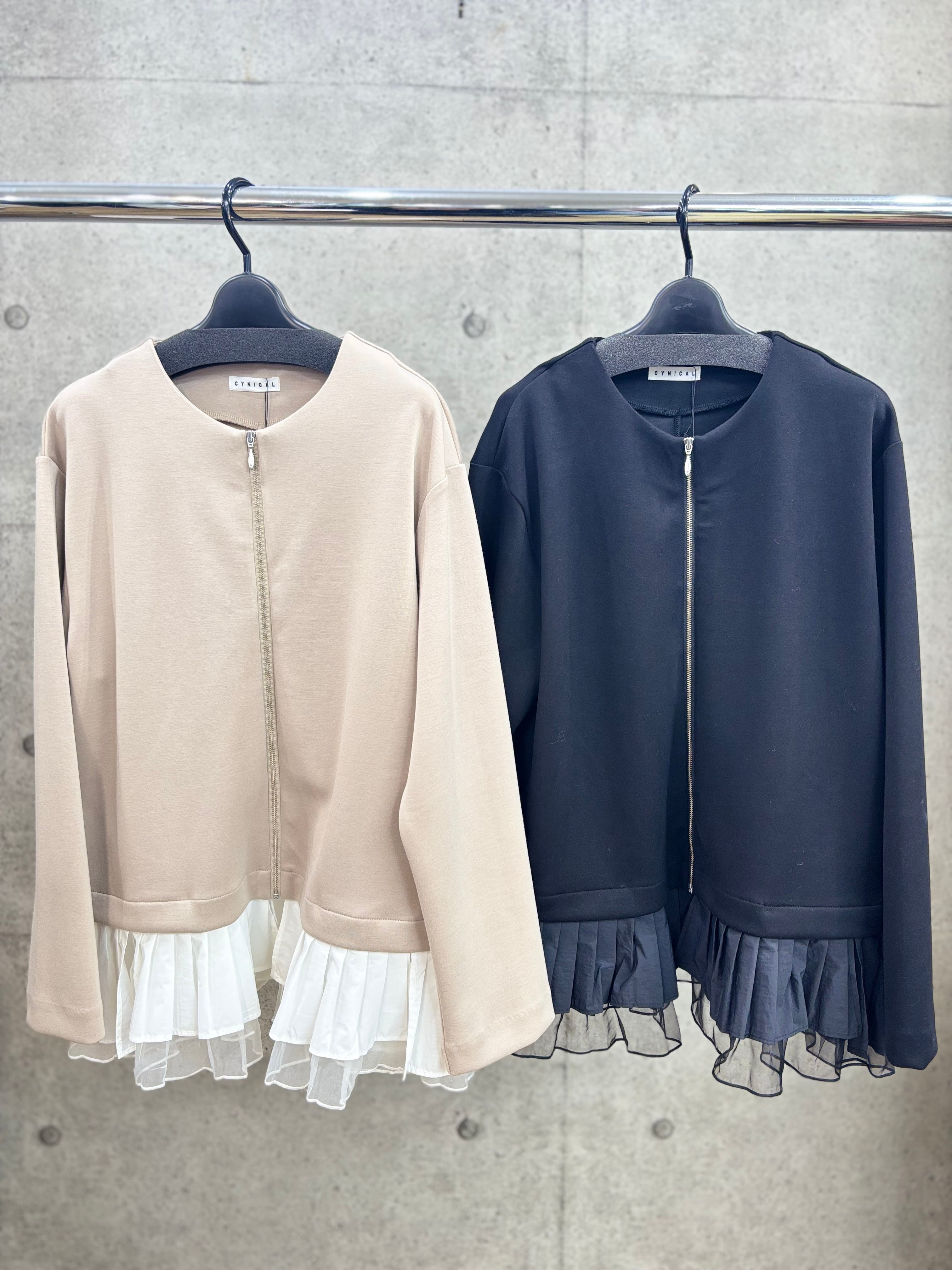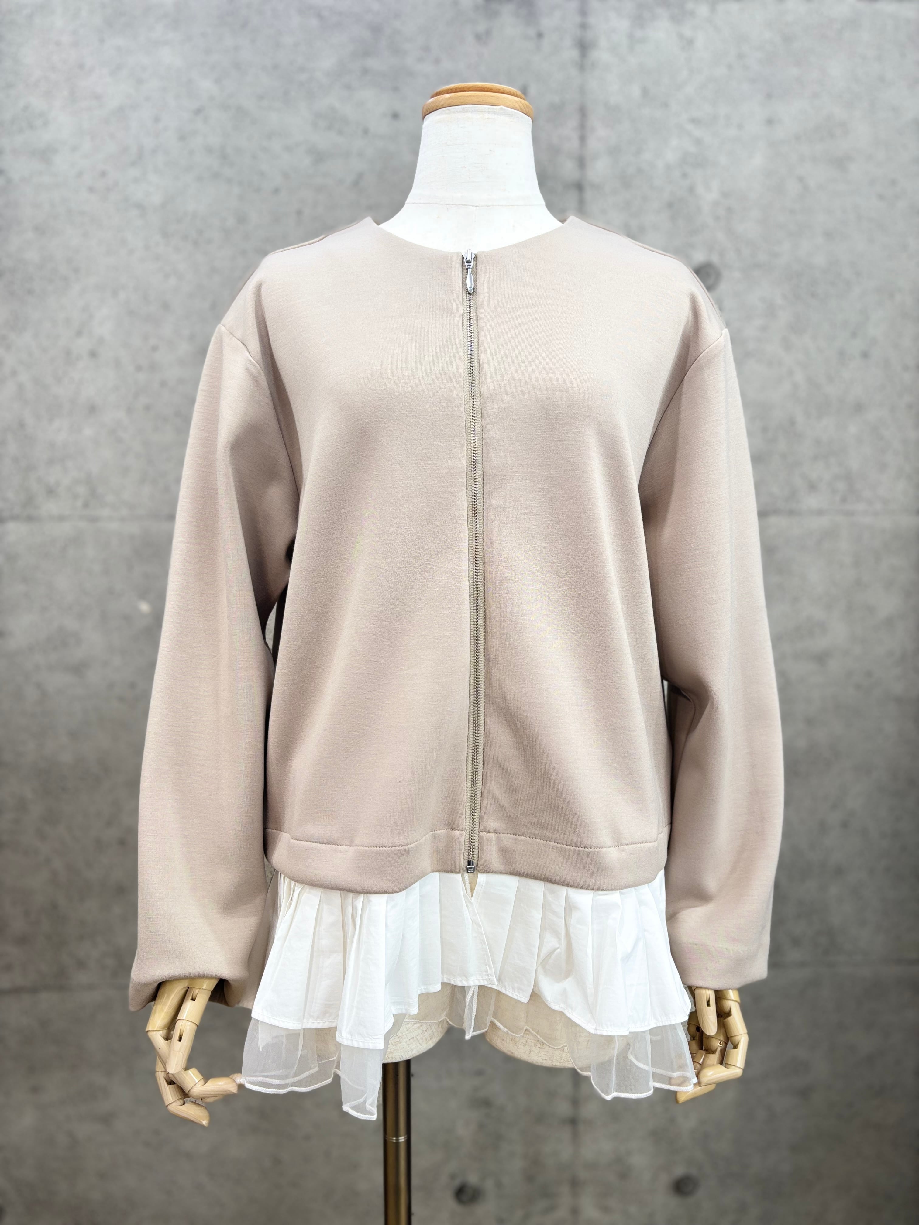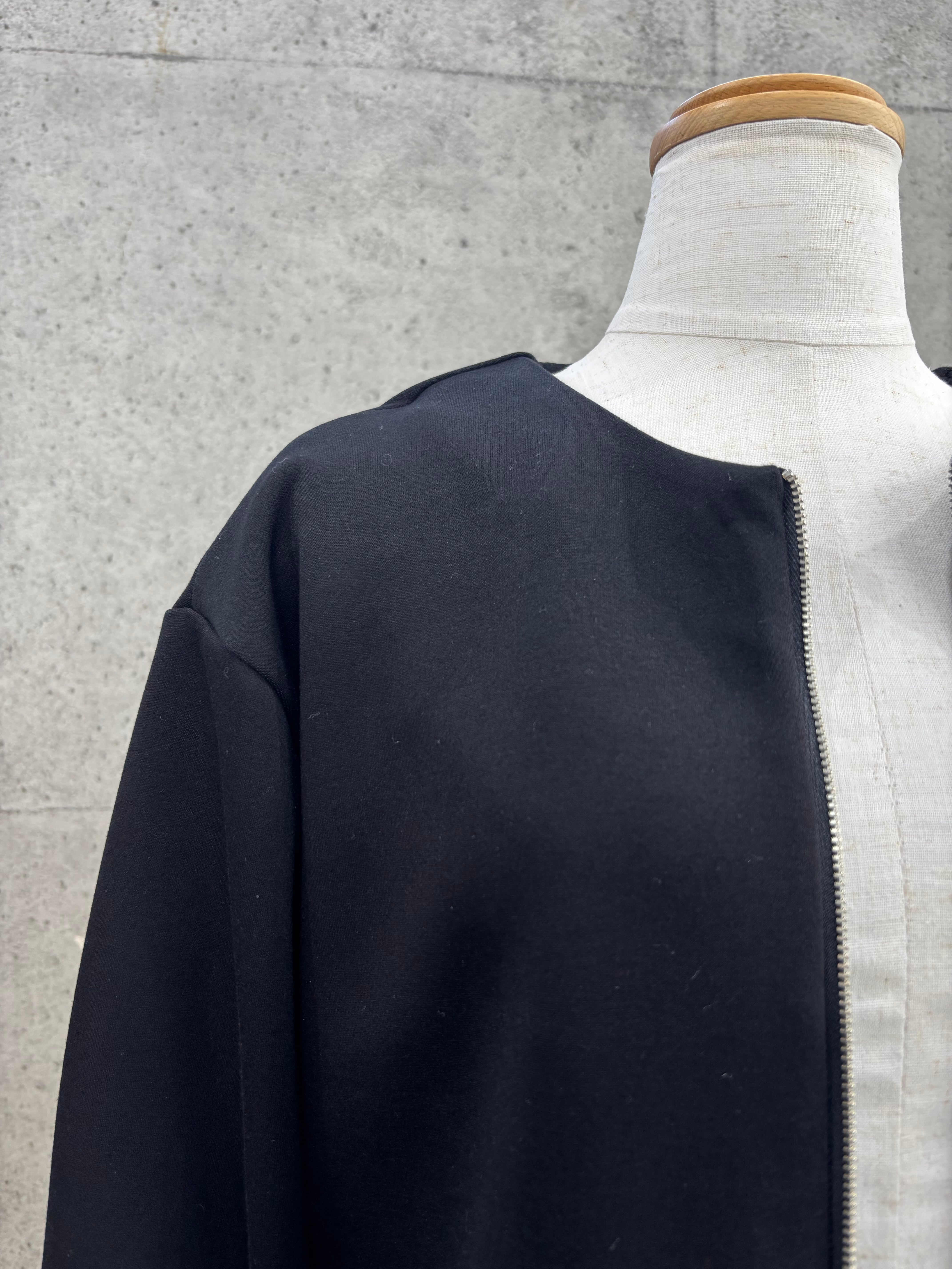 シンプルなノーカラーブルゾンの裾に異素材がアクセントになった大人の1枚