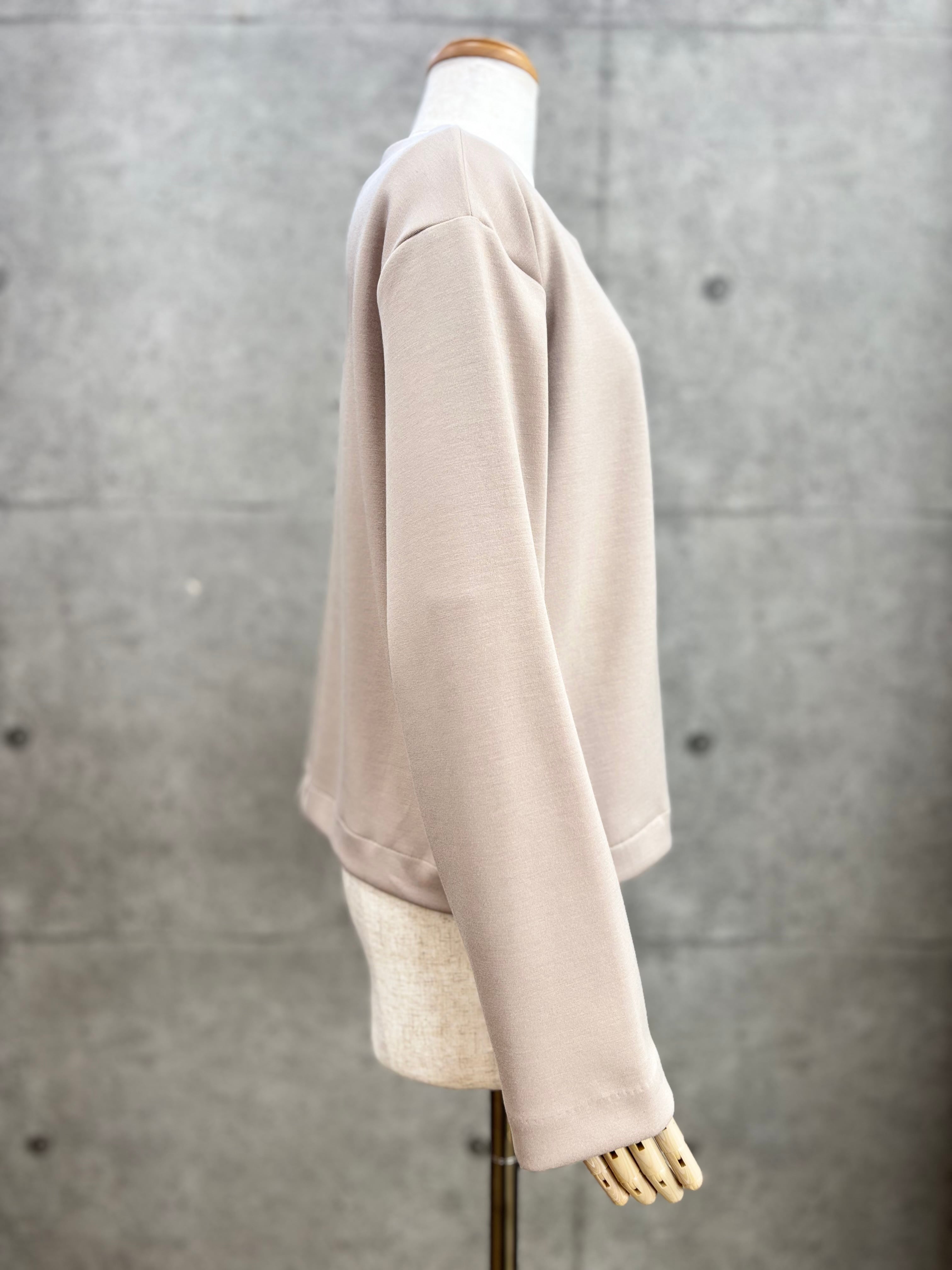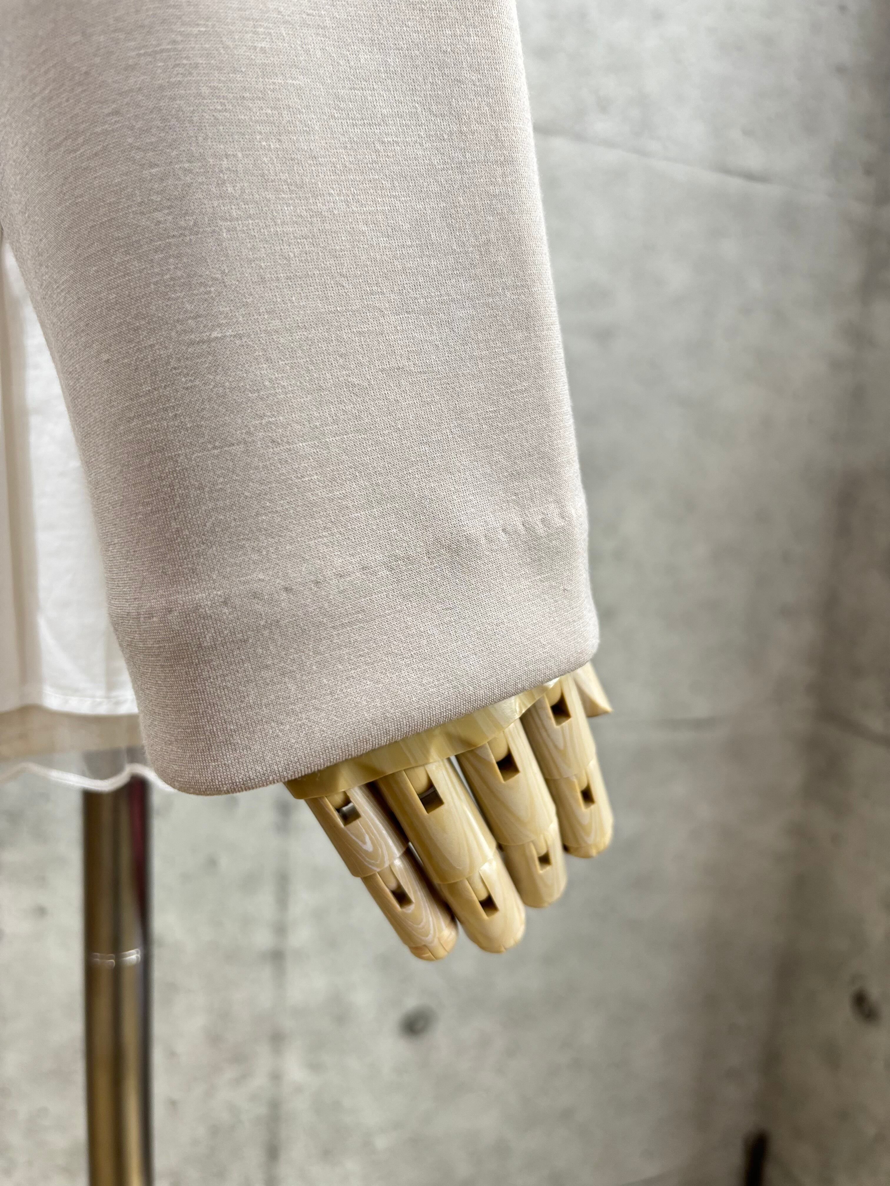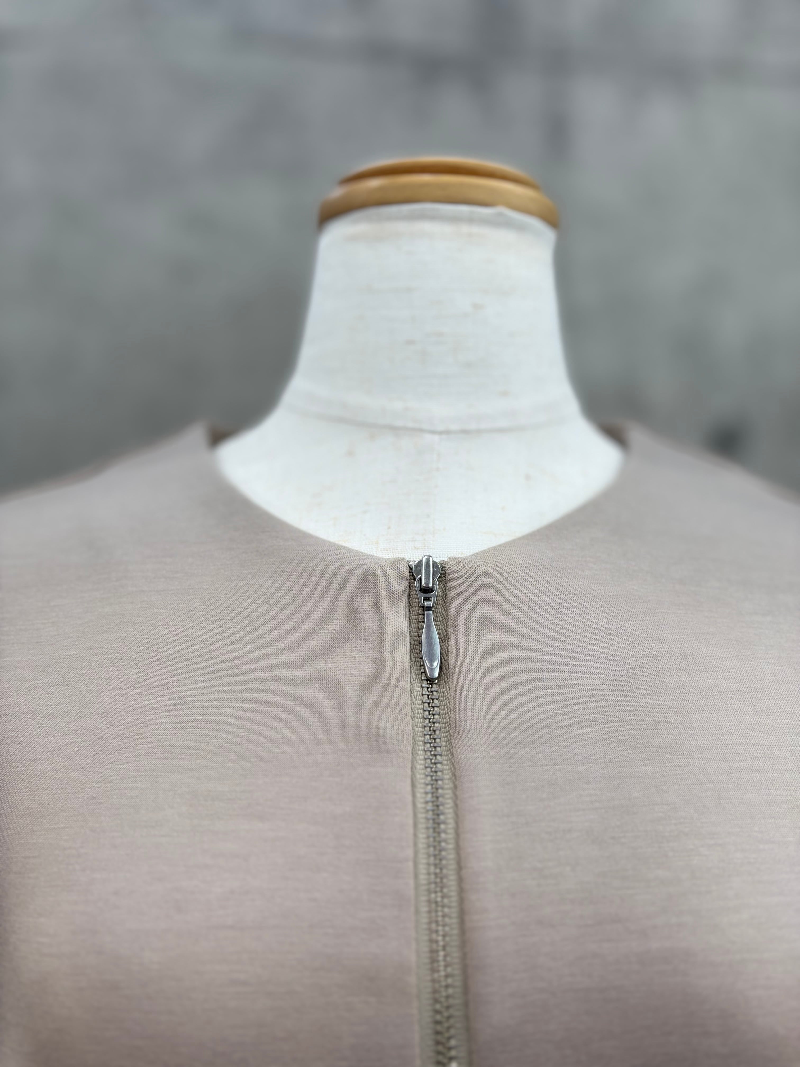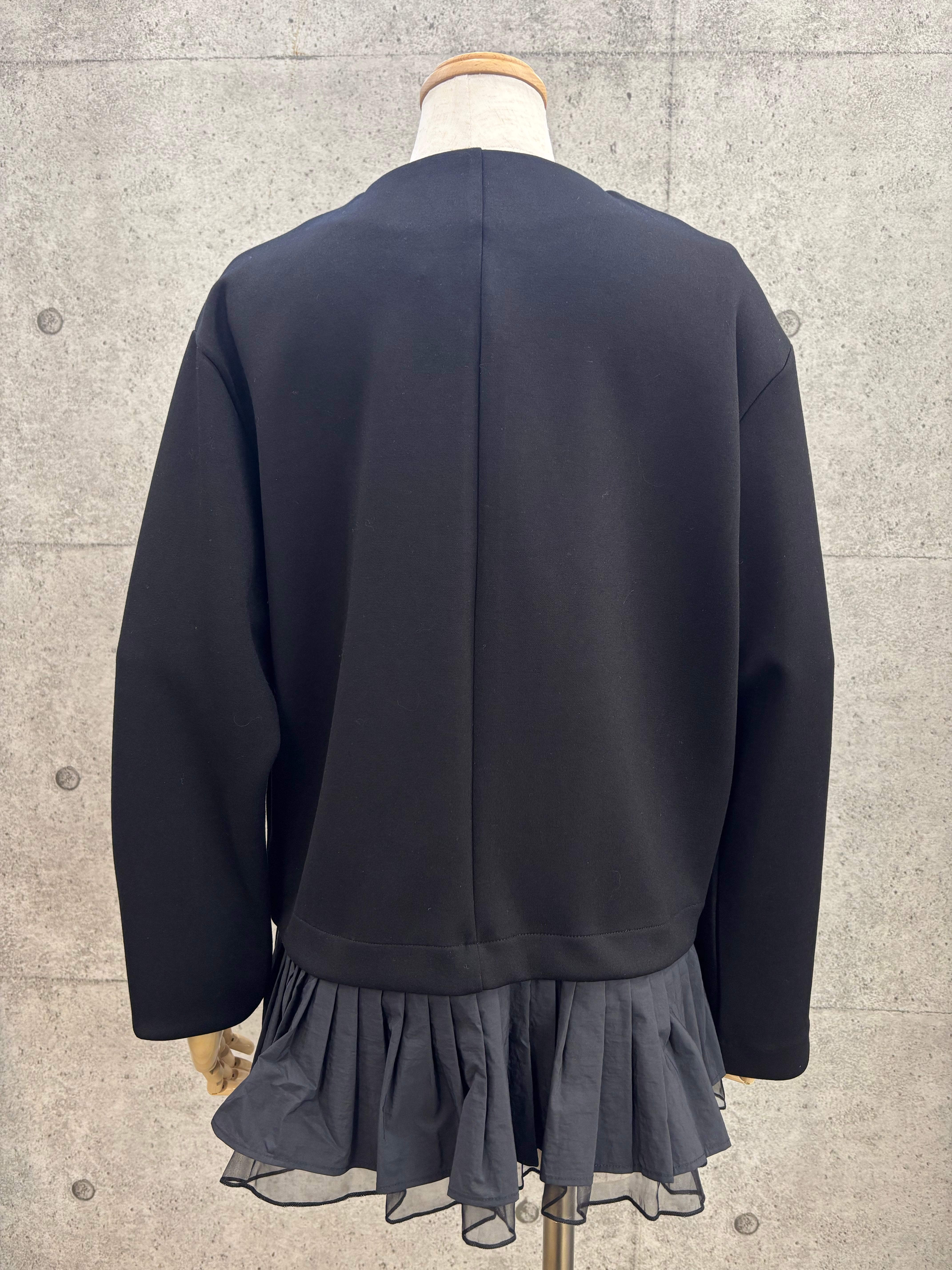 シンプルなノーカラーブルゾンの裾に異素材がアクセントになった大人の1枚
