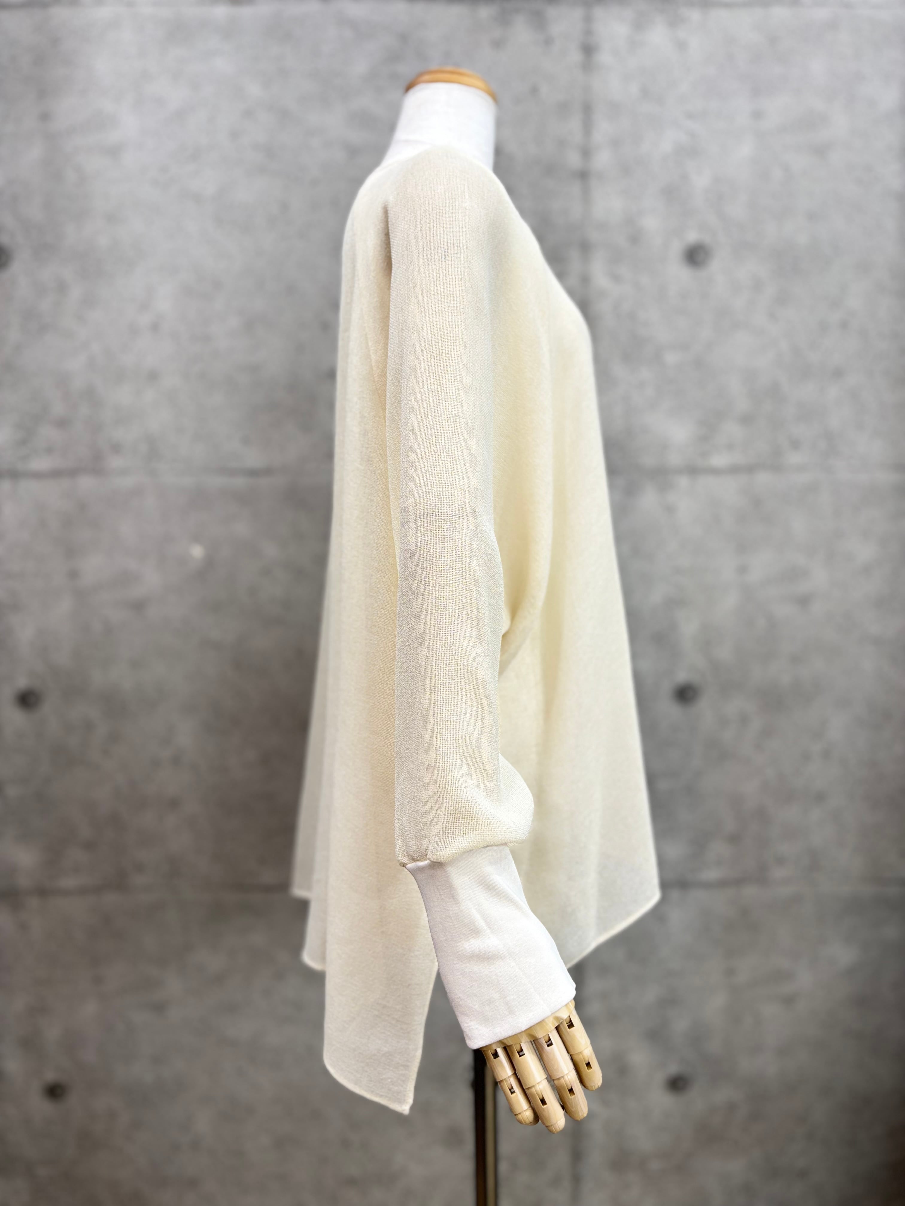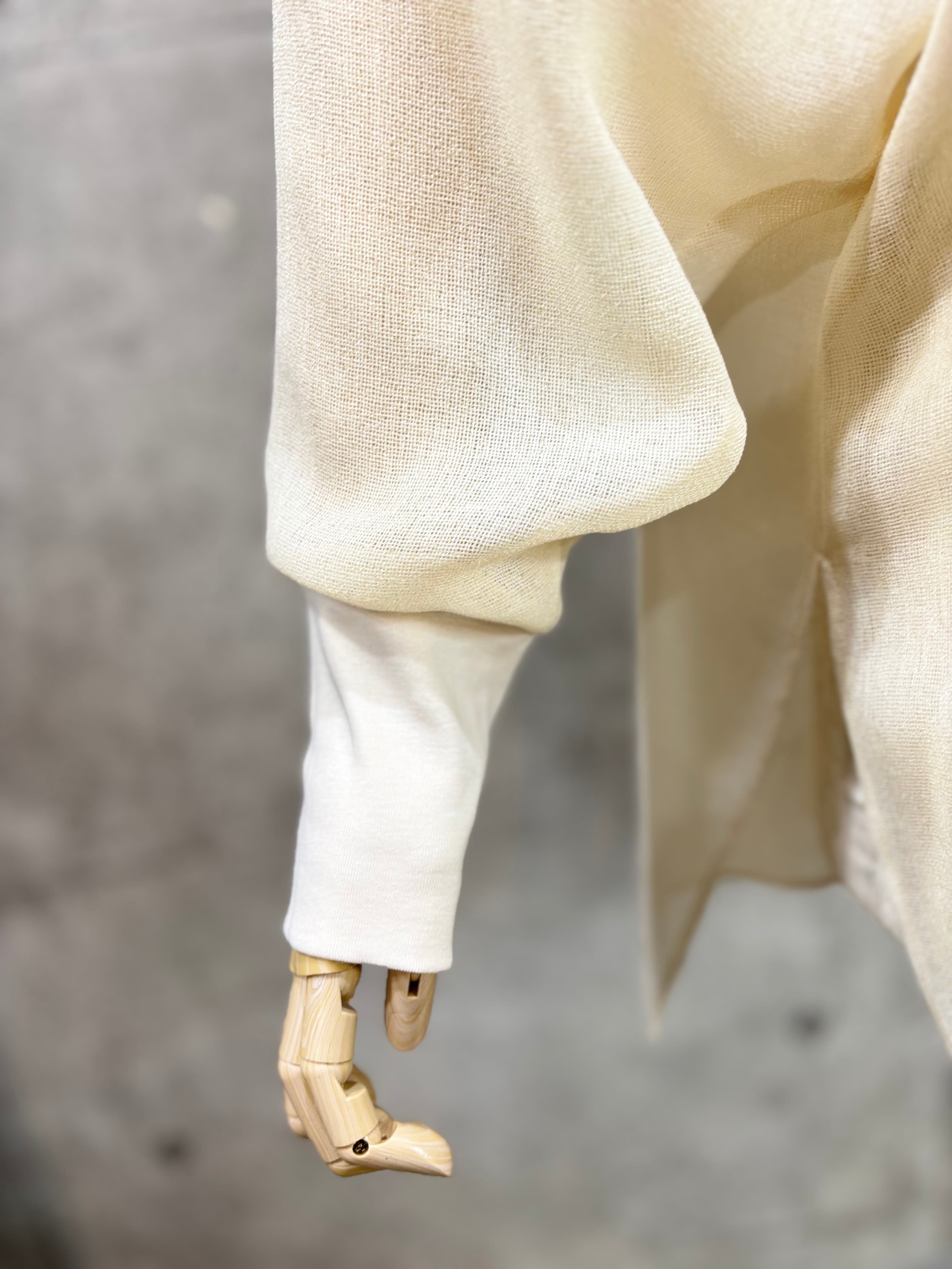 身頃はゆったりとオーバーサイズに仕上げ、袖口にはフライス生地で切り替えを入れることにより腕をたくし上げても落ちてこない仕様に