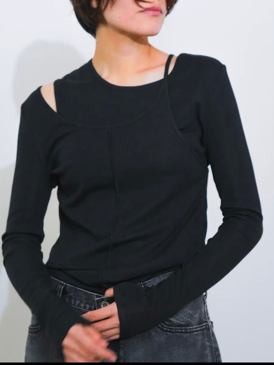 キャミソールを重ね着しているようなバイカラーのデザインが、シンプルになりがちなデイリーコーデにアクセントを添えてくれます