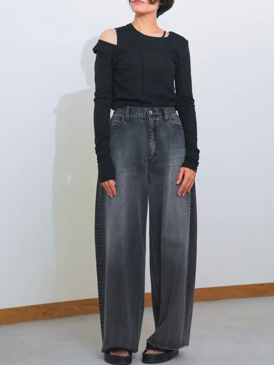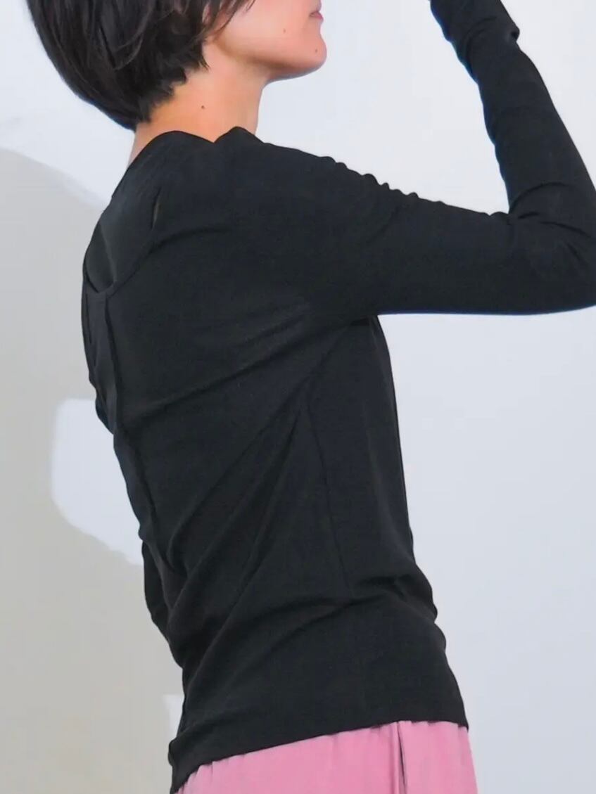 また、長めに設定された袖丈が、手元にニュアンスのある溜まりを作り、女性らしく華奢な印象を演出してくれます。