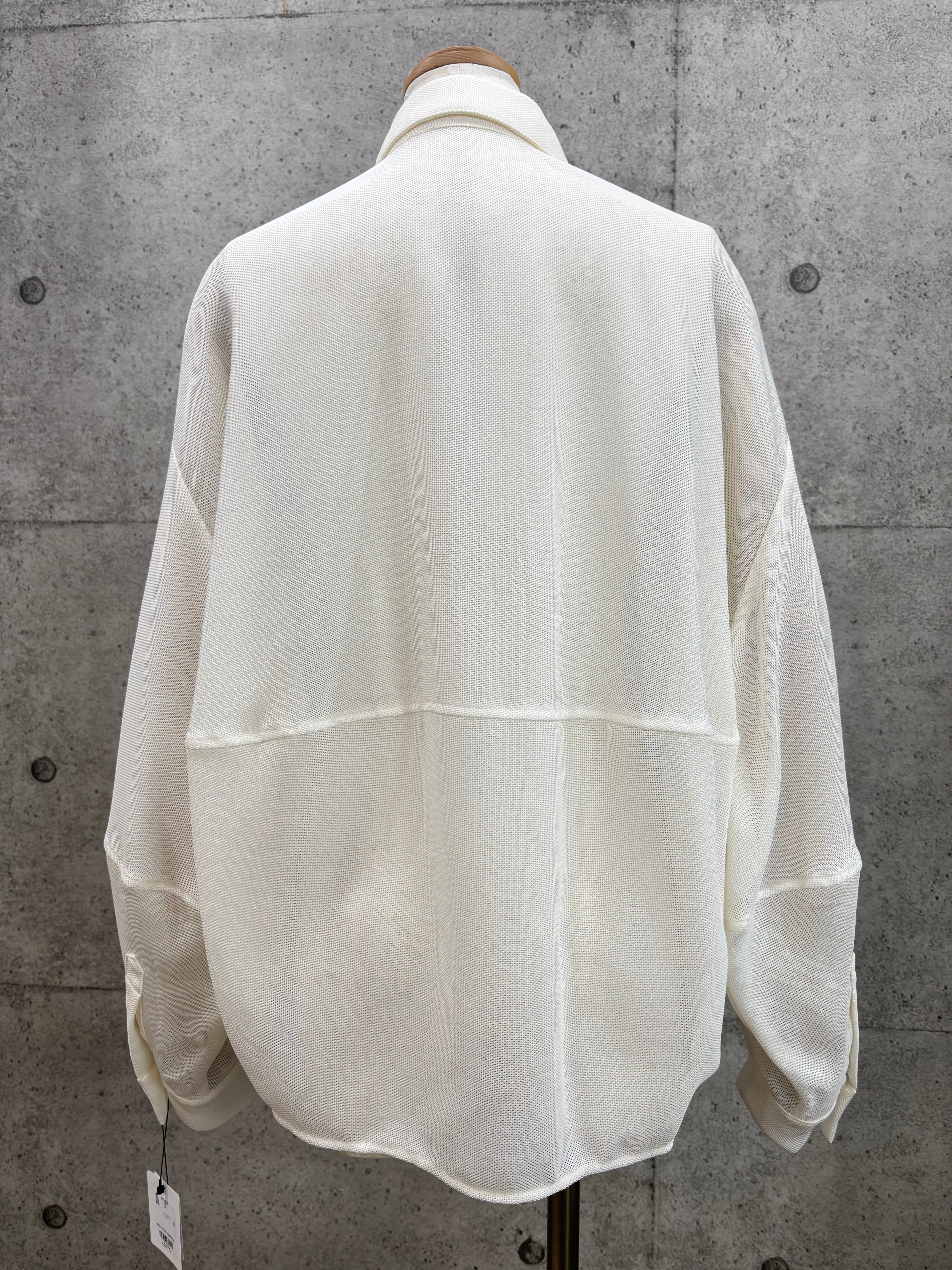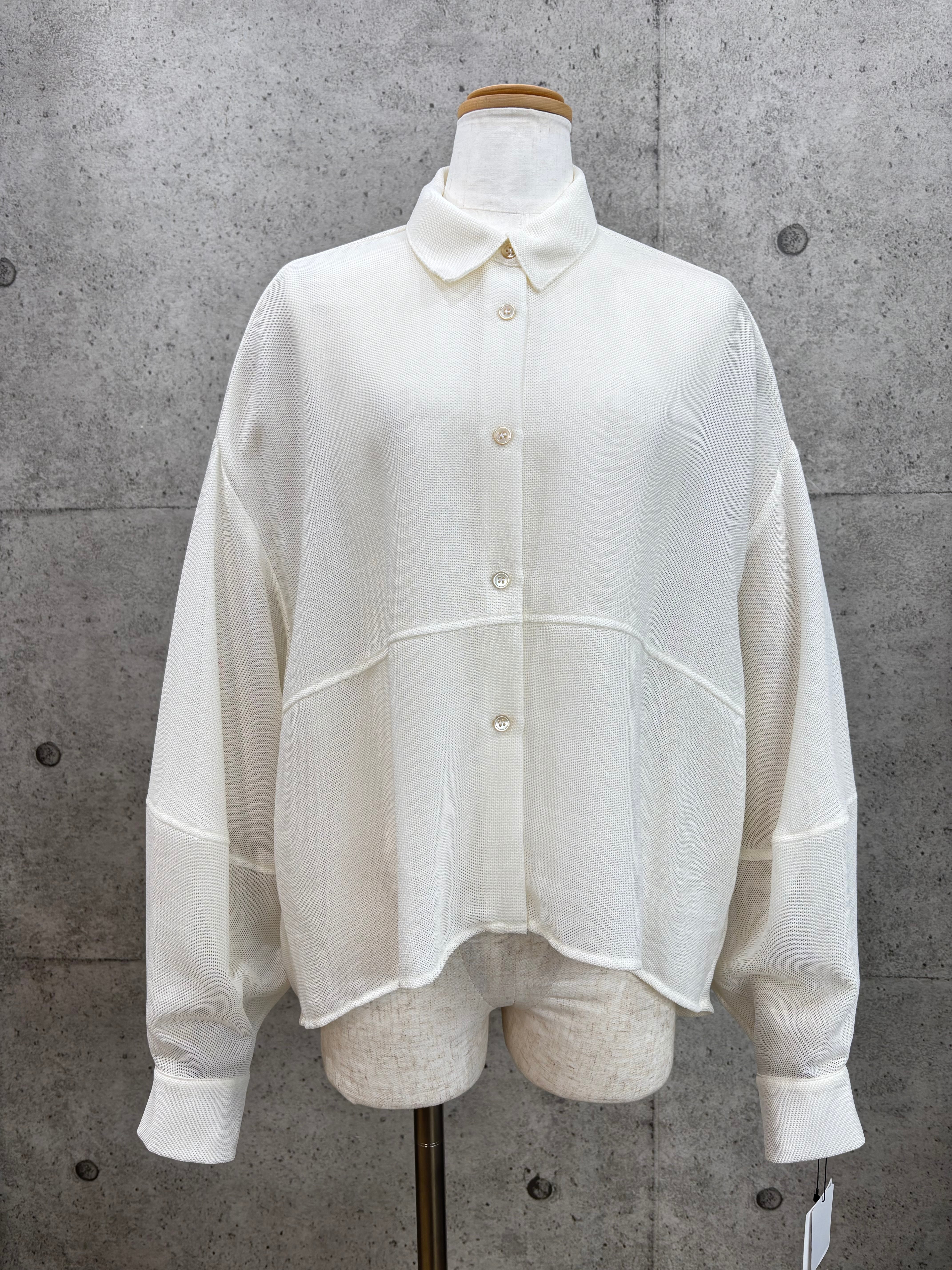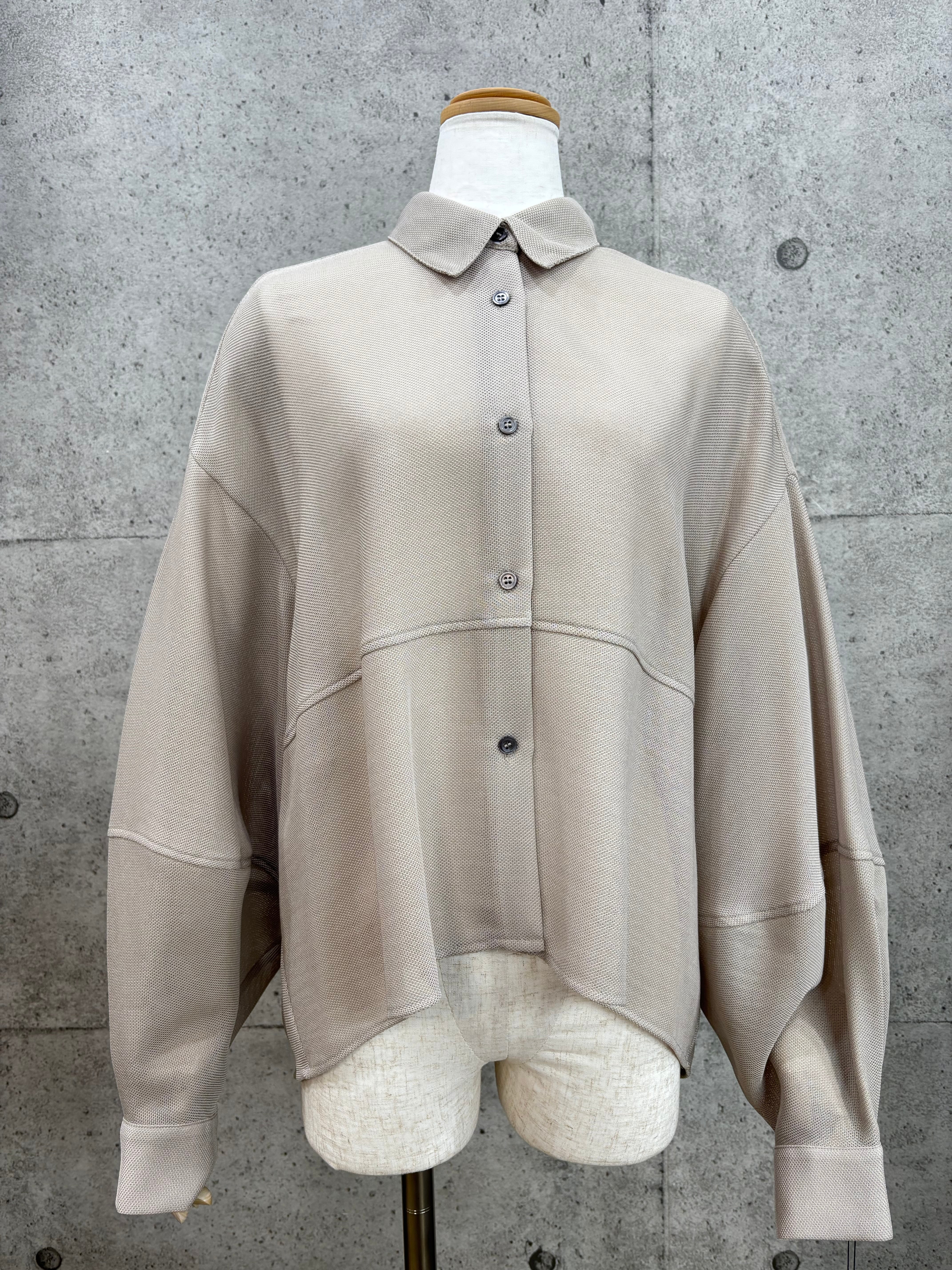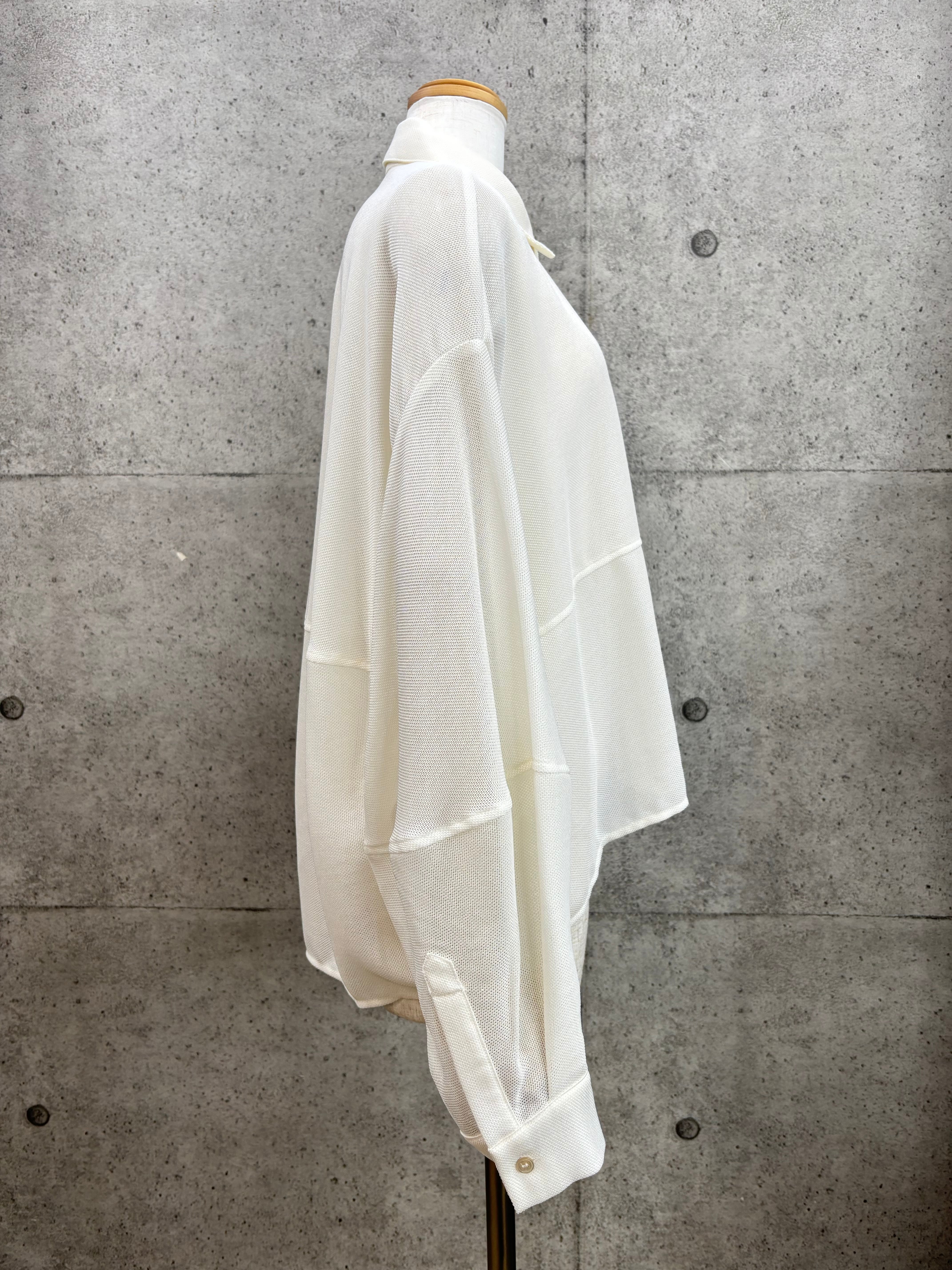 ボリューム袖と後身頃のコクーンシルエットが着るとこなれた感じになったメッシュシャツです
