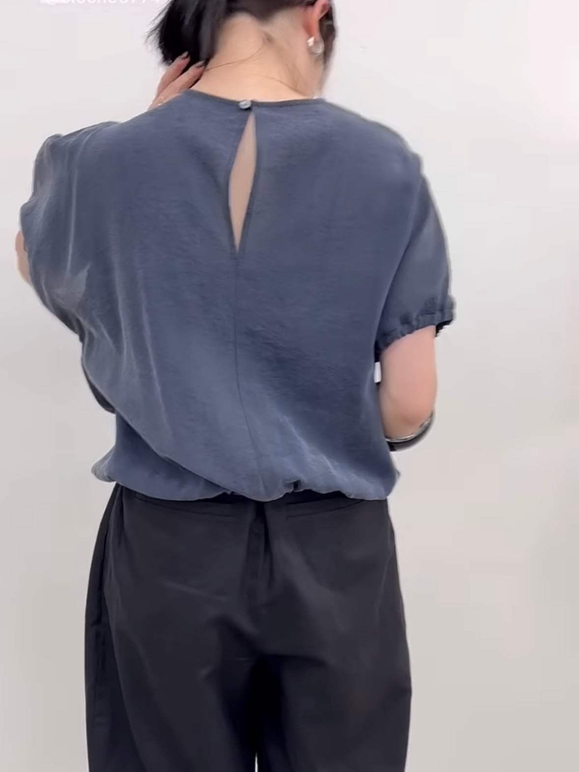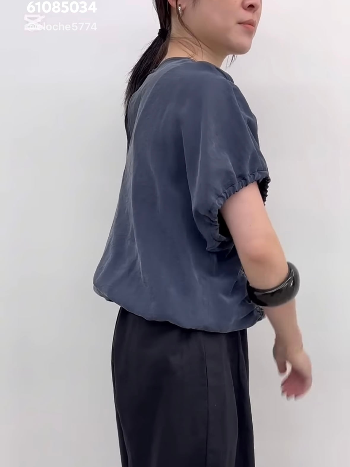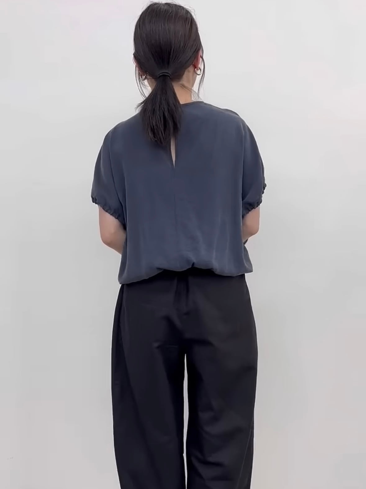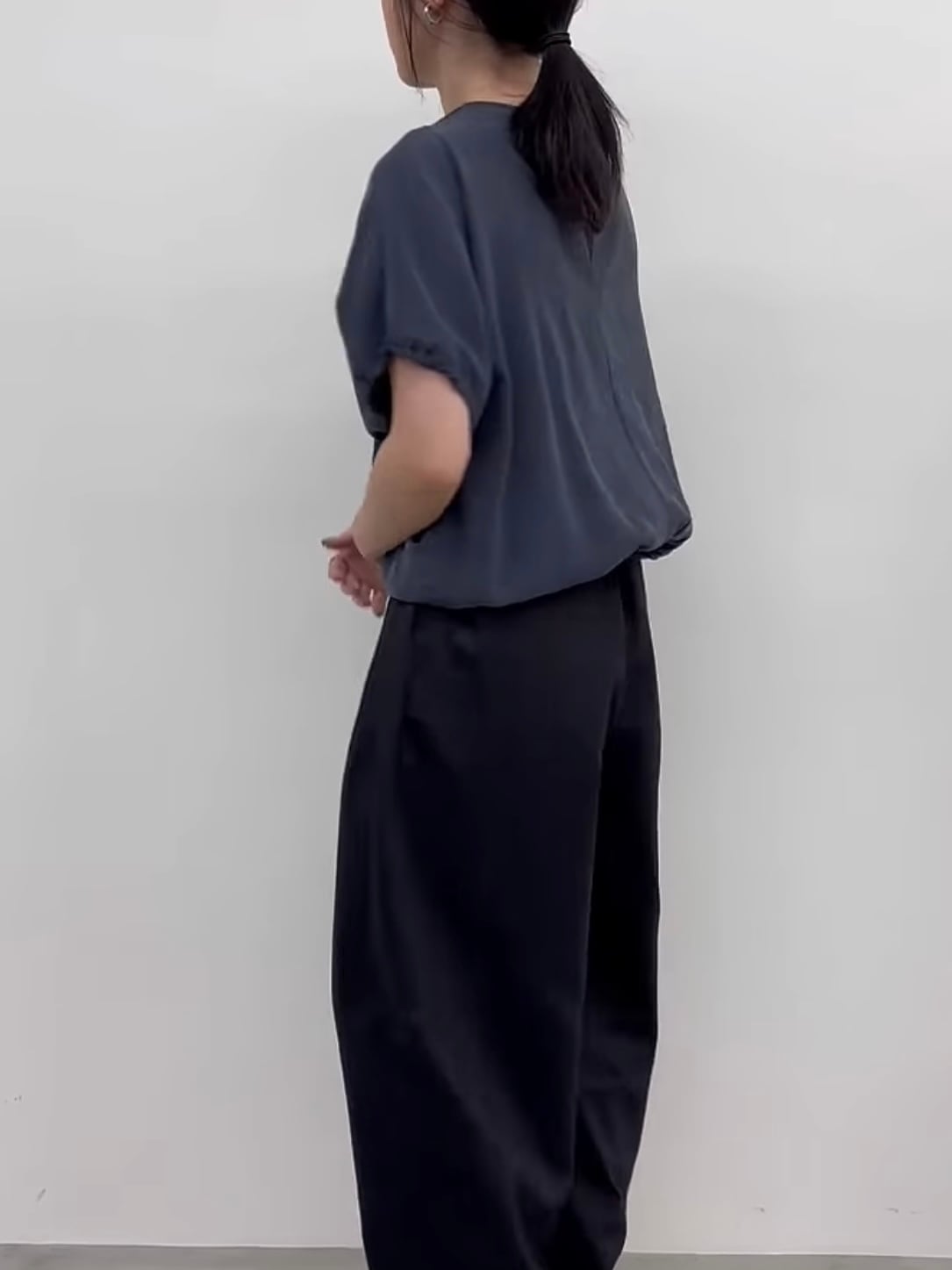 たっぷりギャザーが入る分、着丈は裾にゴムが入っているのでコンパクトに仕上げスッキリとした見え方に