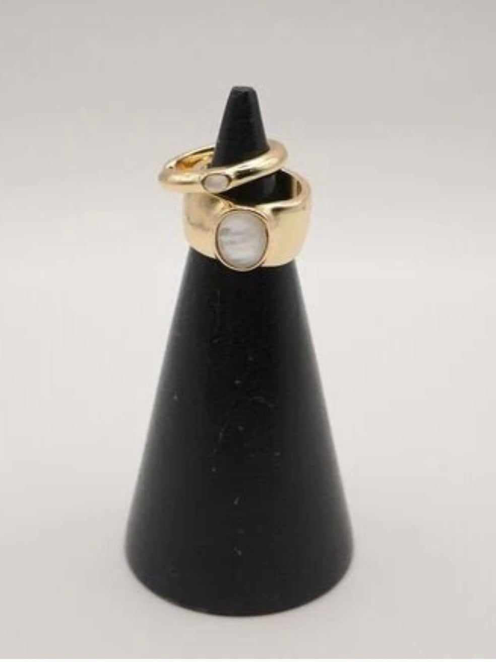 幅広リングは存在感のあるカボションと反対側は斜めに切り込みを入れたようなデザイン、細リングは小さなカボションと開き口を真横に取ったデザインに仕上げています。